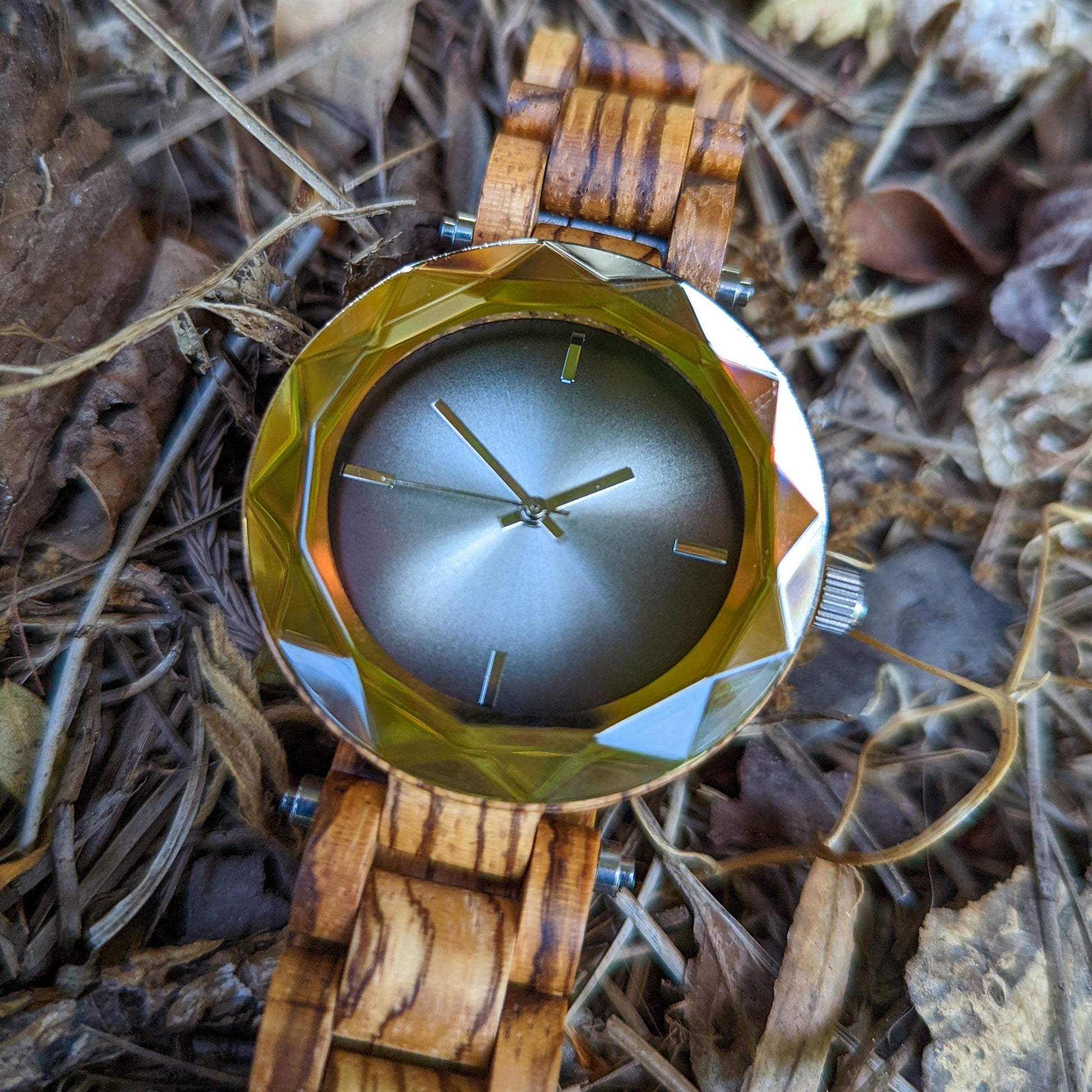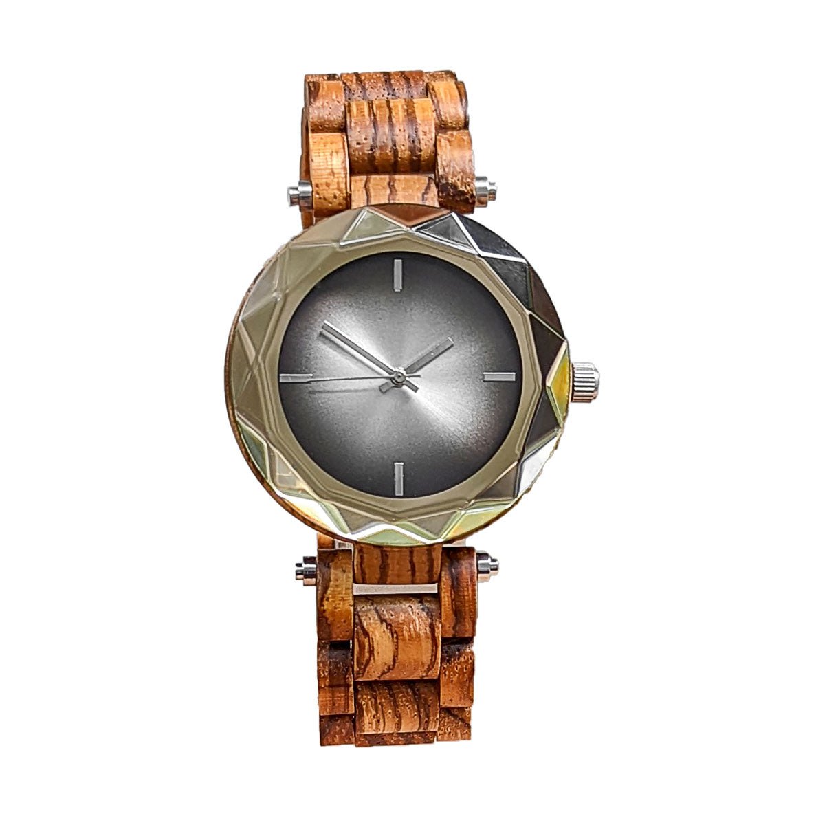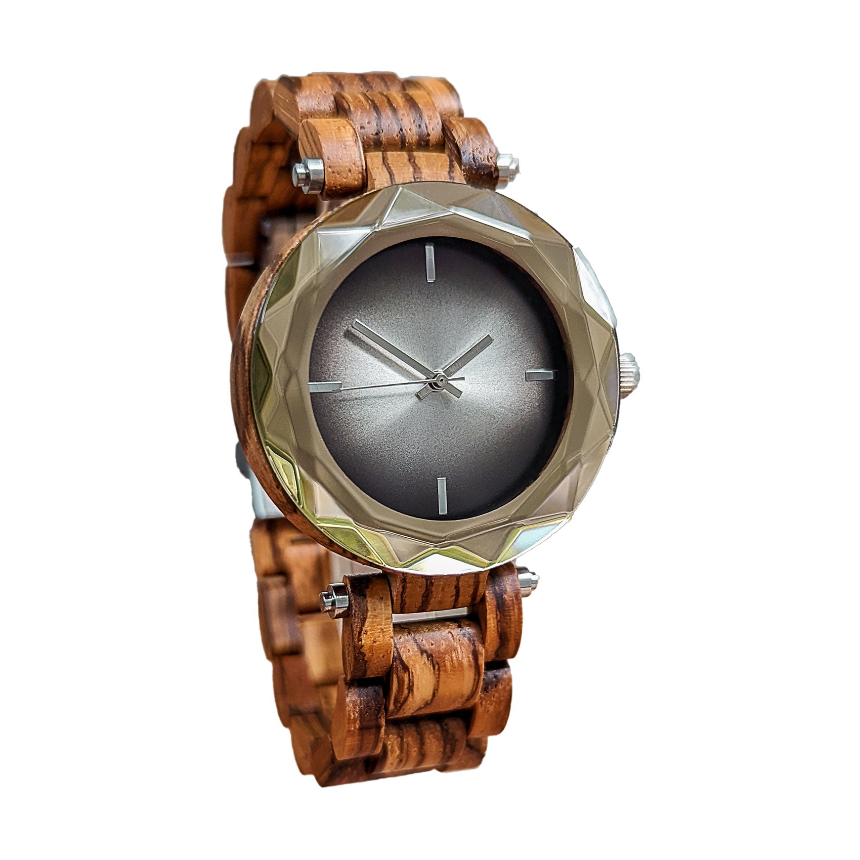 This stunning women's wood watch features a crystal overlay depicting a diamond look. It is the perfect watch for that glamorous look which transcends the time stamp. This timepiece speaks to females who possess exquisite taste.