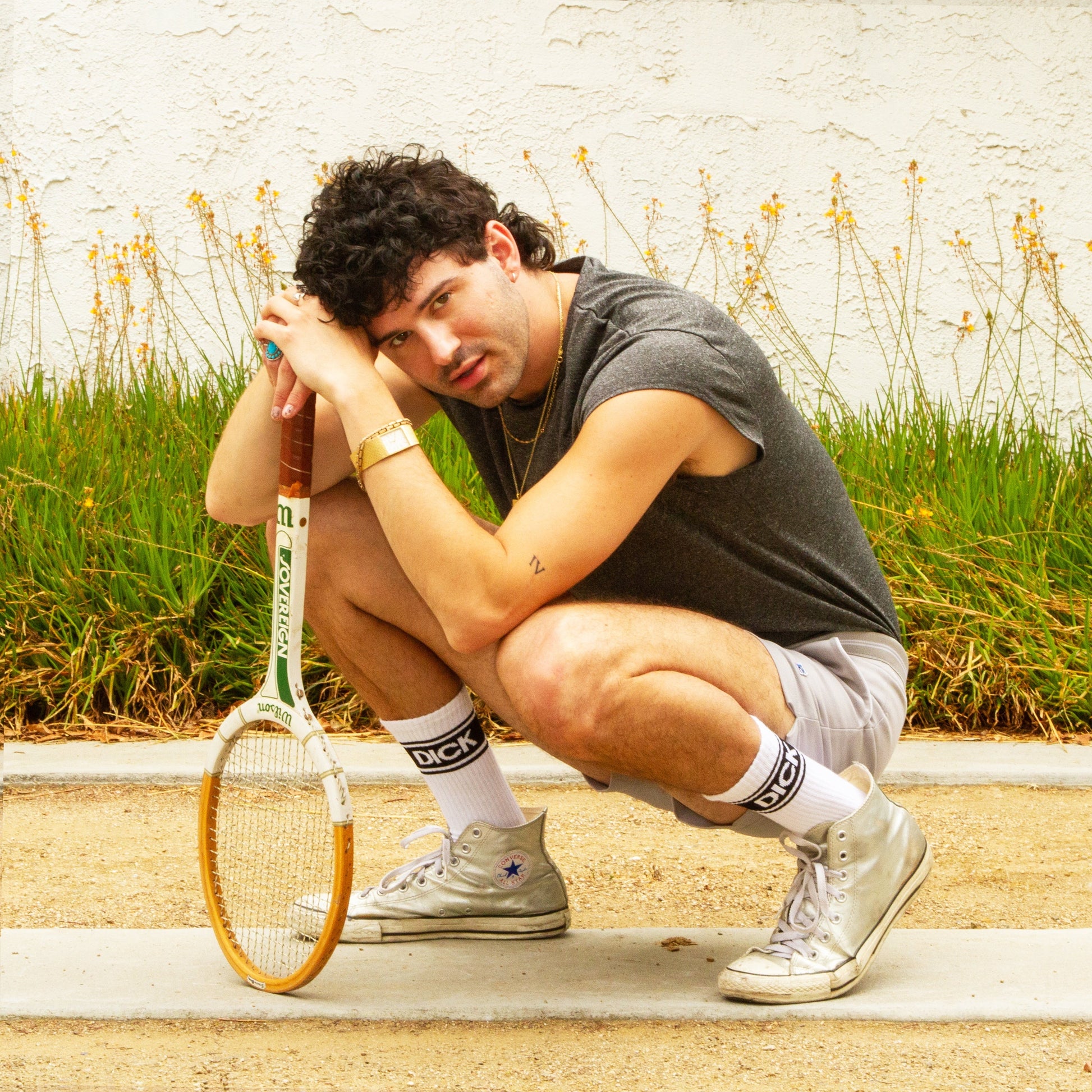 These 'Dick' socks are pretty straightforward. They're white crew socks with a black band around the top that says, well, 'DICK'. The visible portion of the sock also has a black heel and toe. Simple, bold, and ready to make a statement. They're shown paired with silver high-tops in the images, but hey, they'll look good with whatever you're wearing.