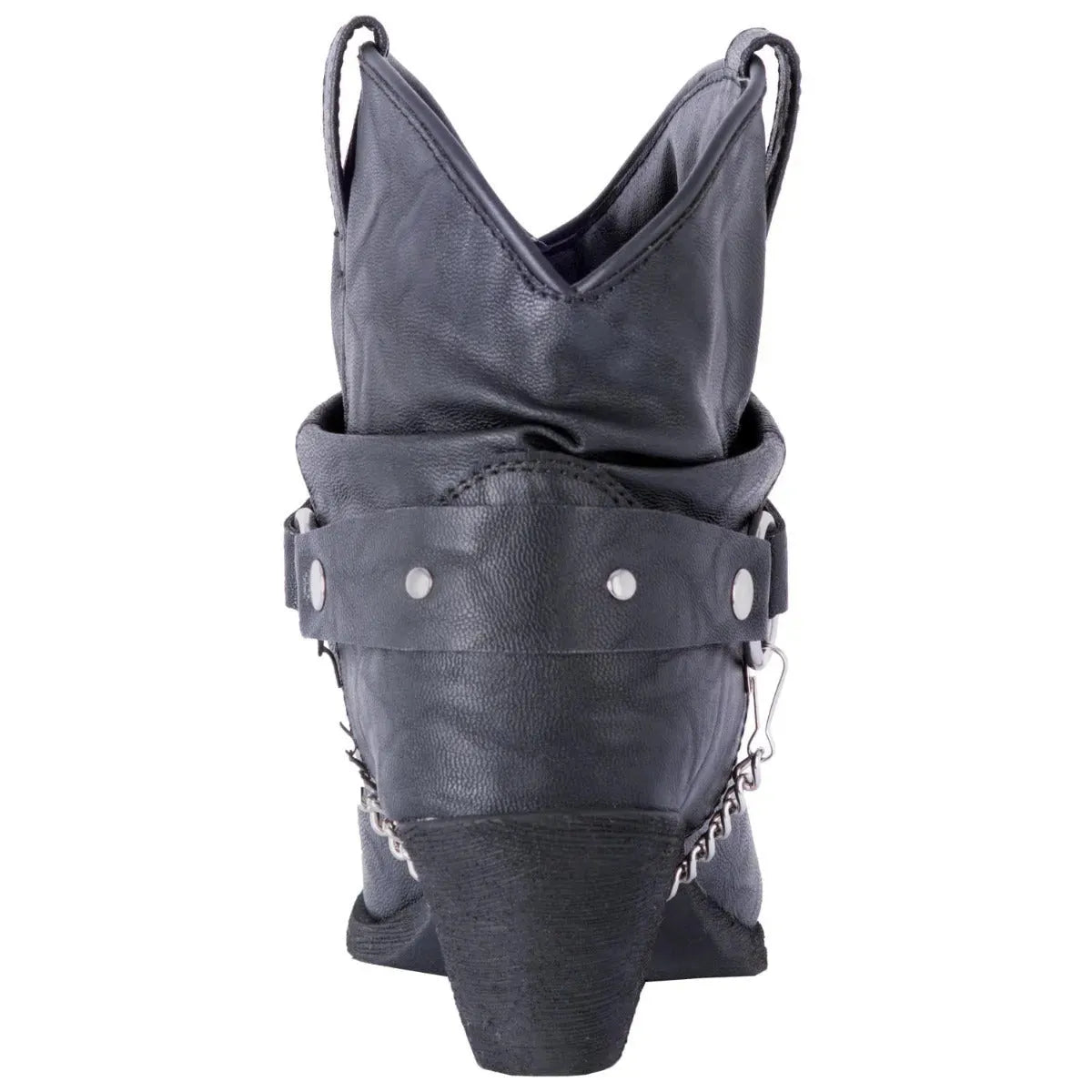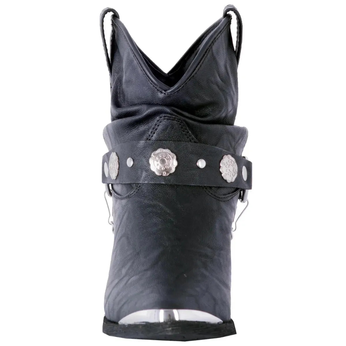 The Fiona boot by Dingo is a stylish and versatile footwear option that boasts a unique blend of functionality and fashion. The boots are crafted with manmade leather, which offers the durability and strength of genuine leather without the high cost. The material also provides a sleek and polished appearance that is perfect for any occasion. One of the standout features of the Fiona boot is its comfortable slouched shaft, which offers a relaxed and laid-back look. The shaft is designed to conform to the natural contours of the leg, providing a comfortable fit that is ideal for all-day wear. Additionally, the boots are dressed up with a Concho harness that adds a touch of Western flair to the overall design. The Fiona boot is also adorned with just enough silver accents to make them stand out in the crowd. The silver accents are subtle yet eye-catching, and they add a touch of elegance and sophistication to the overall design. This feature makes the boots perfect for both casual and formal occasions.