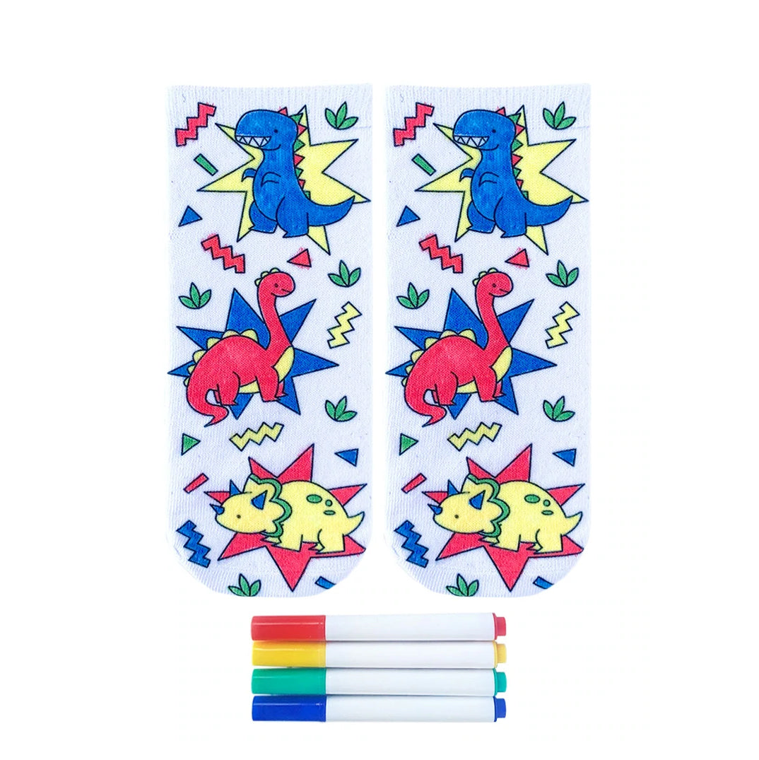 Grab your markers and unleash your inner artist as you color a world of prehistoric creatures with these Dino Daze Coloring Socks! Say goodbye to boring white socks and let your feet be the canvas for a colorful dinosaur adventure. Triceratops, stegosaurus, and other primeval pals await your artistic touch. Let your imagination roar and add your own colorful flair to these crew socks made just for women and kids.