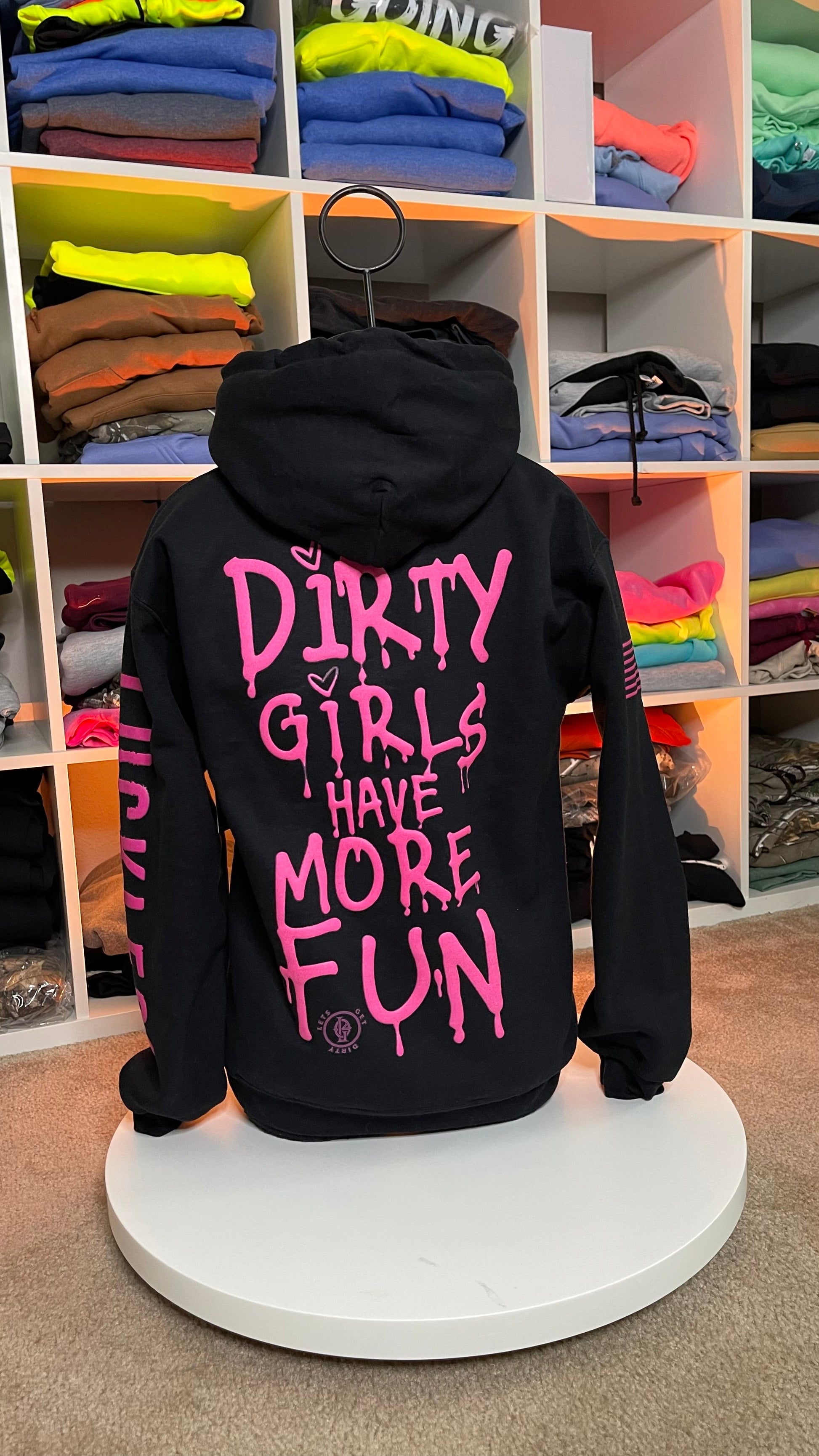 Step into your wild side with our sultry black hoodie, adorned with a provocative declaration: "Dirty Girls Have More Fun" in tantalizing pink puff ink. Made for the spirited Women who fearlessly embrace life's untamed moments, this hoodie is your invitation to revel in the thrill of adventure with a touch of Southern sass. Whether you're stomping through muddy trails or dancing under the moonlit sky, let your uninhibited spirit shine through. It's not just a garment; it's a manifesto of freedom, sensuality, and the irresistible allure of getting a little dirty along the way. So slip into our "Dirty Girls Have More Fun" hoodie and unleash your inner vixen. After all, the most exhilarating adventures await those who dare to embrace their wild side.