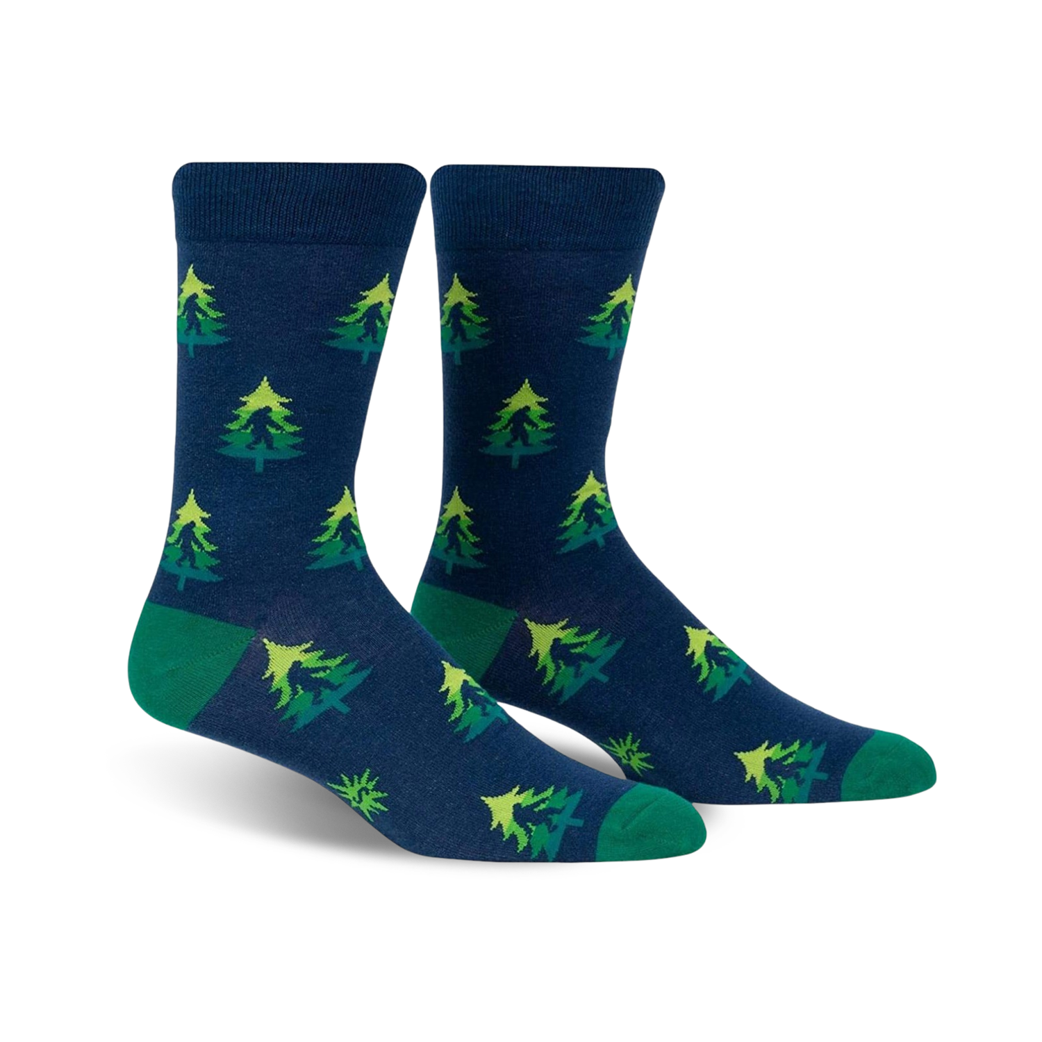 Walk through the forest with Bigfoot with these fun, bright crew socks. If you're looking for a sock that's perfect for nature walks or hanging out at home, these dark blue crew socks feature a pattern of green pine trees with green toes and heels.