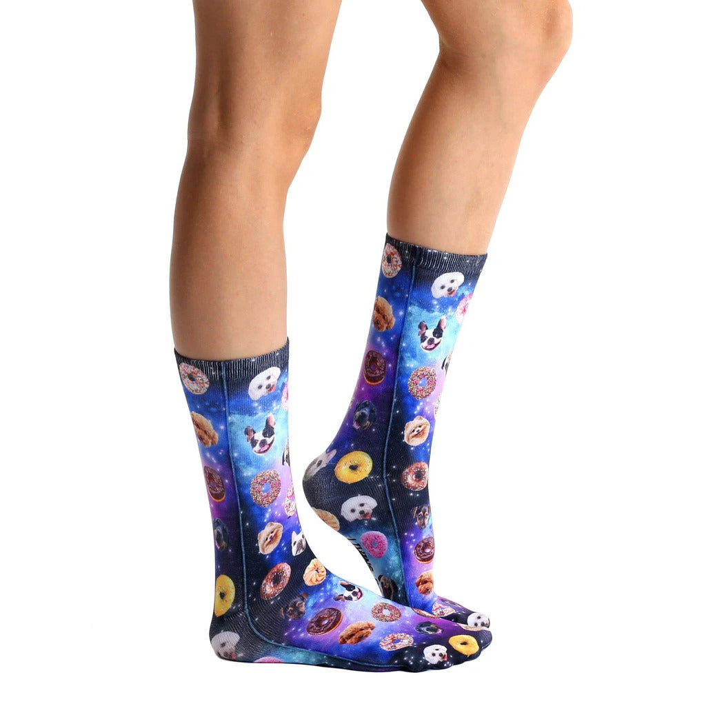 Unleash your inner canine cravings with Dog Cravings novelty socks! These paw-some socks feature a cosmic compilation of dogs in space, surrounded by a celestial feast of colorful sprinkles and delightful donuts. Each sock proudly showcases man's best friend with open mouths, ready to devour these tasty treats. Gear up with these cosmic canine cravings, and let your feet embark on an out-of-this-world adventure!