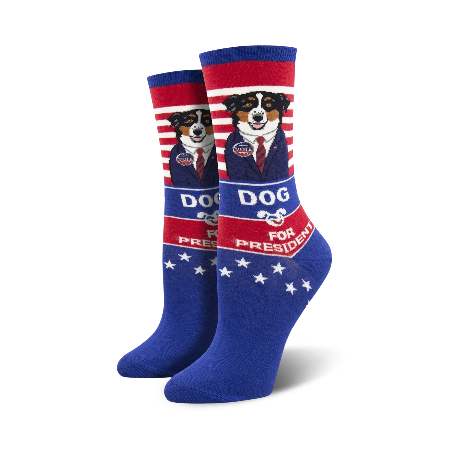 Woof! Show your support for the canine candidate in these paw-some Dog for President socks! These blue crew socks feature a cartoon dog wearing a suit and tie and a "Vote" sticker. Strut your stuff in these paw-litical socks and let everyone know who you're voting for!