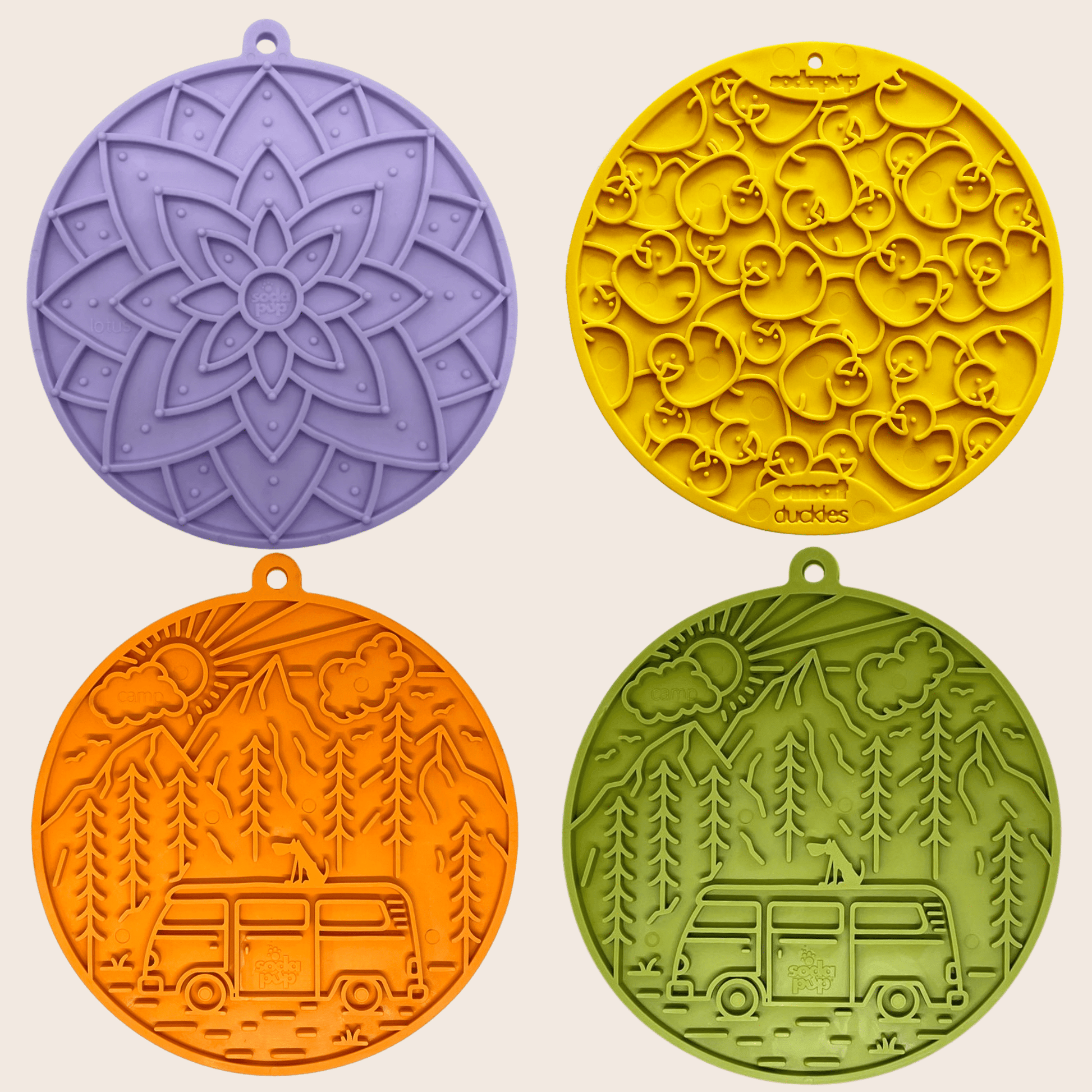These adorable suction cup lick mats are more than a plate for healthy dog treats! Providing both pet enrichment and slow feeding benefits, SodaPup® lick mats for dogs are the perfect way for pups to experience the soothing sensation of licking in a healthy way. Just spread or sprinkle your pet's favorite soft treat or Farm to Pet dog food topper on the licking mat, press down into the surface, and watch them lick away stress, focusing on the yummy tastes and calming effects instead! Plus, the added suction cups mean that whether you put them in the bath or use them on the go, these dog lick mats will stay put!