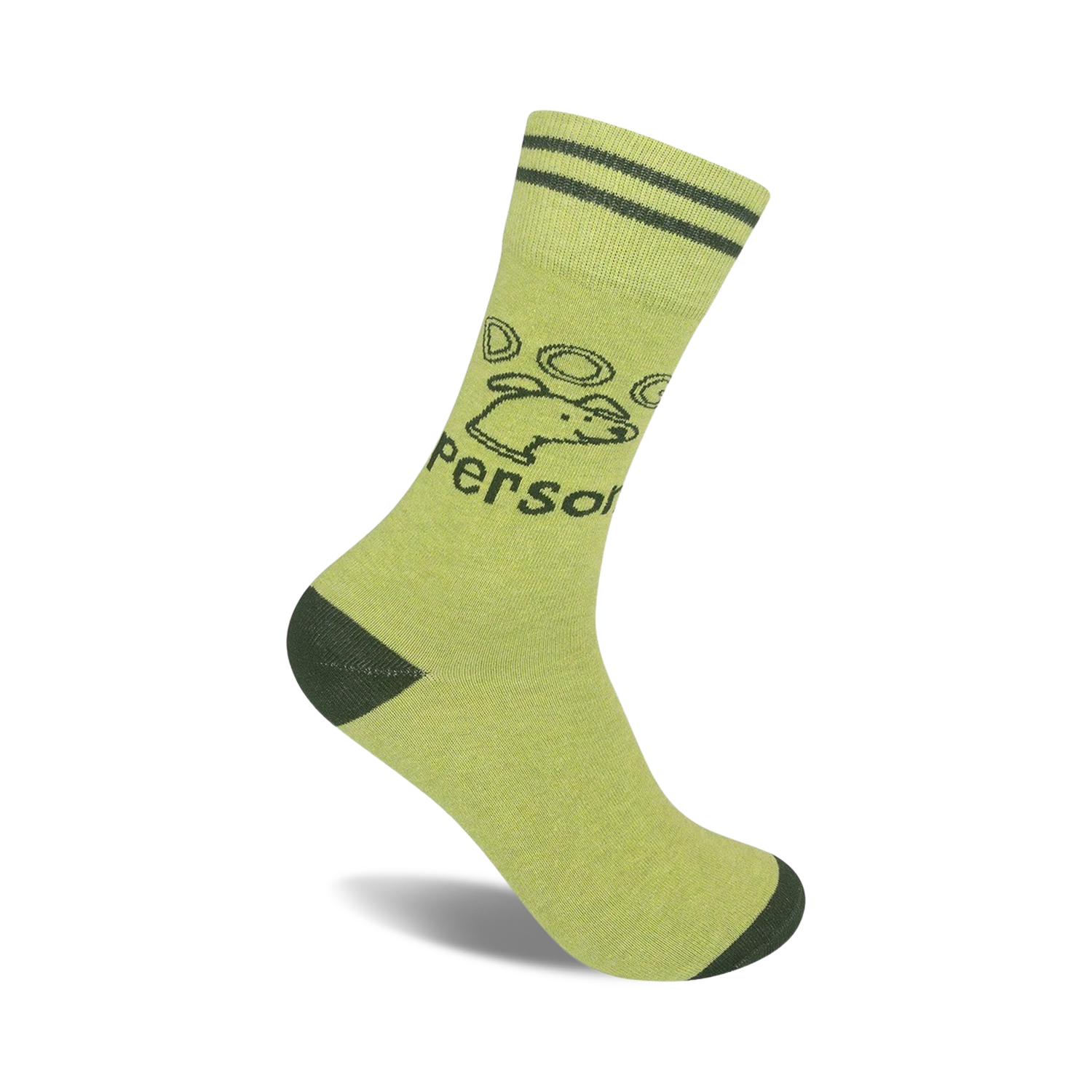 Unleash your inner canine companion with our 'Dog Person' socks! These paw-some crew socks are made for those who live life on the leash. With their light green background, dark green 'Dog Person' text, and paw print, these socks will have you howling with delight. The two dark green stripes near the top add a touch of sophistication, making them the perfect accessory for any dog lover.