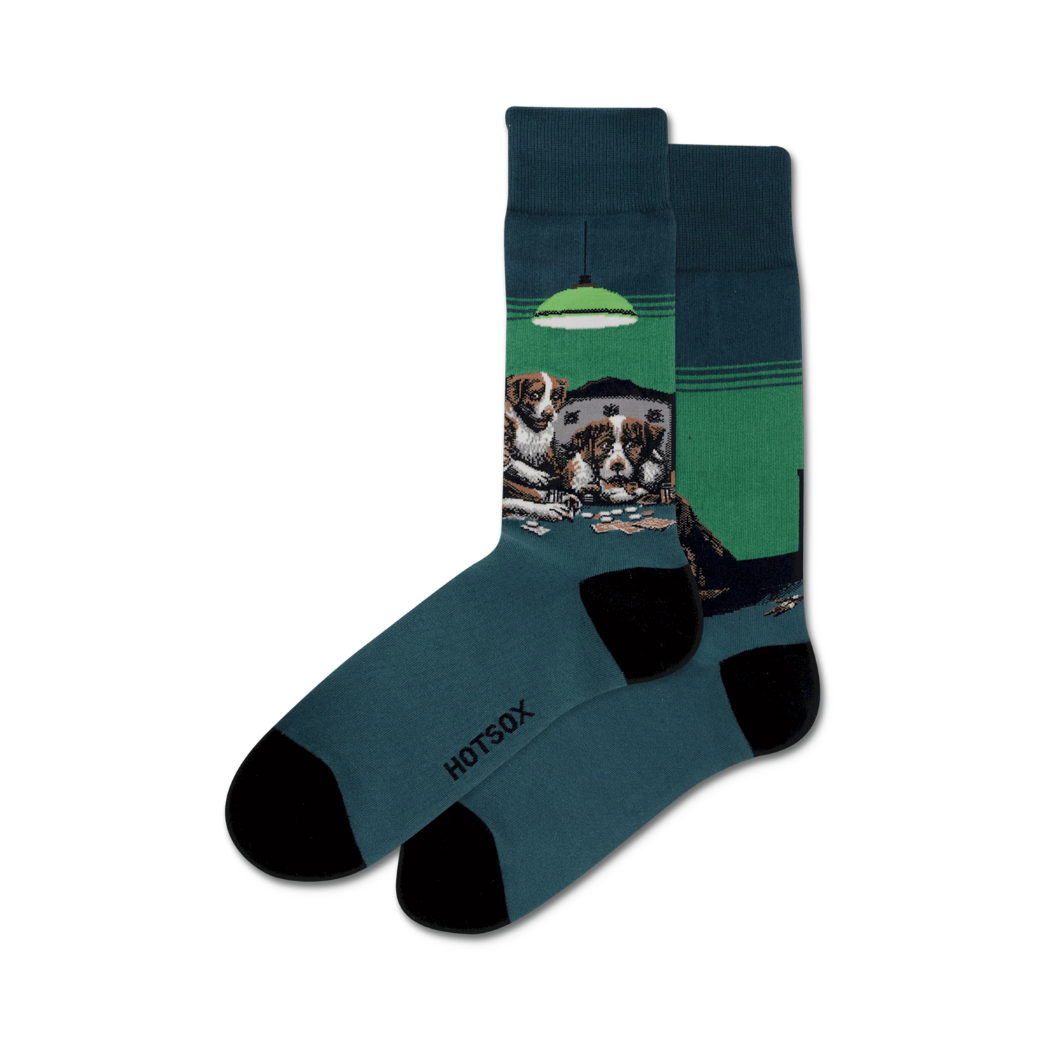 Feast your eyes on these dog poker game socks! Watch the pups stare down at their cards, each hoping to win the pot. Who will come out on top? Only time will tell. Put on these dark green crew socks for men and let the good times roll! Walk a mile in these cool dog-themed, playing poker novelty socks!