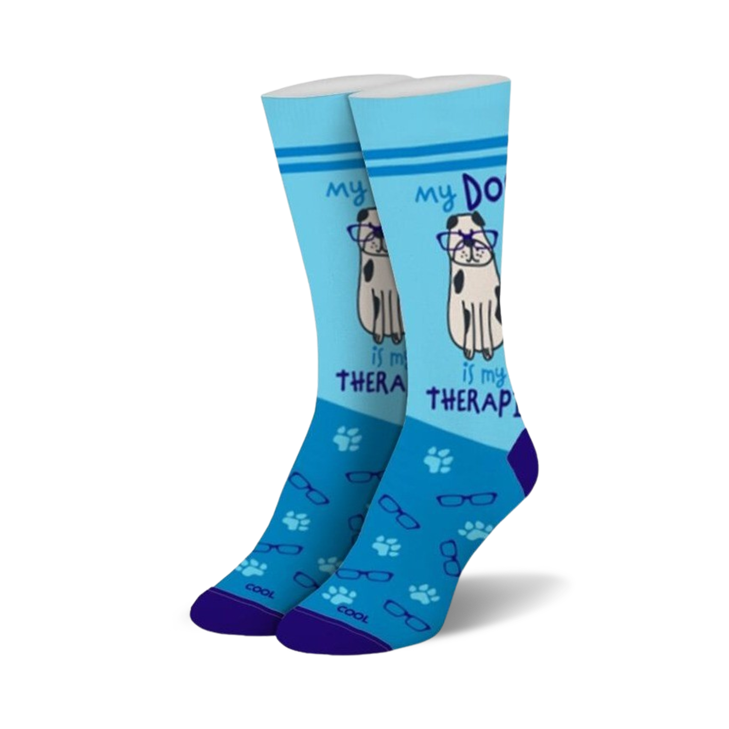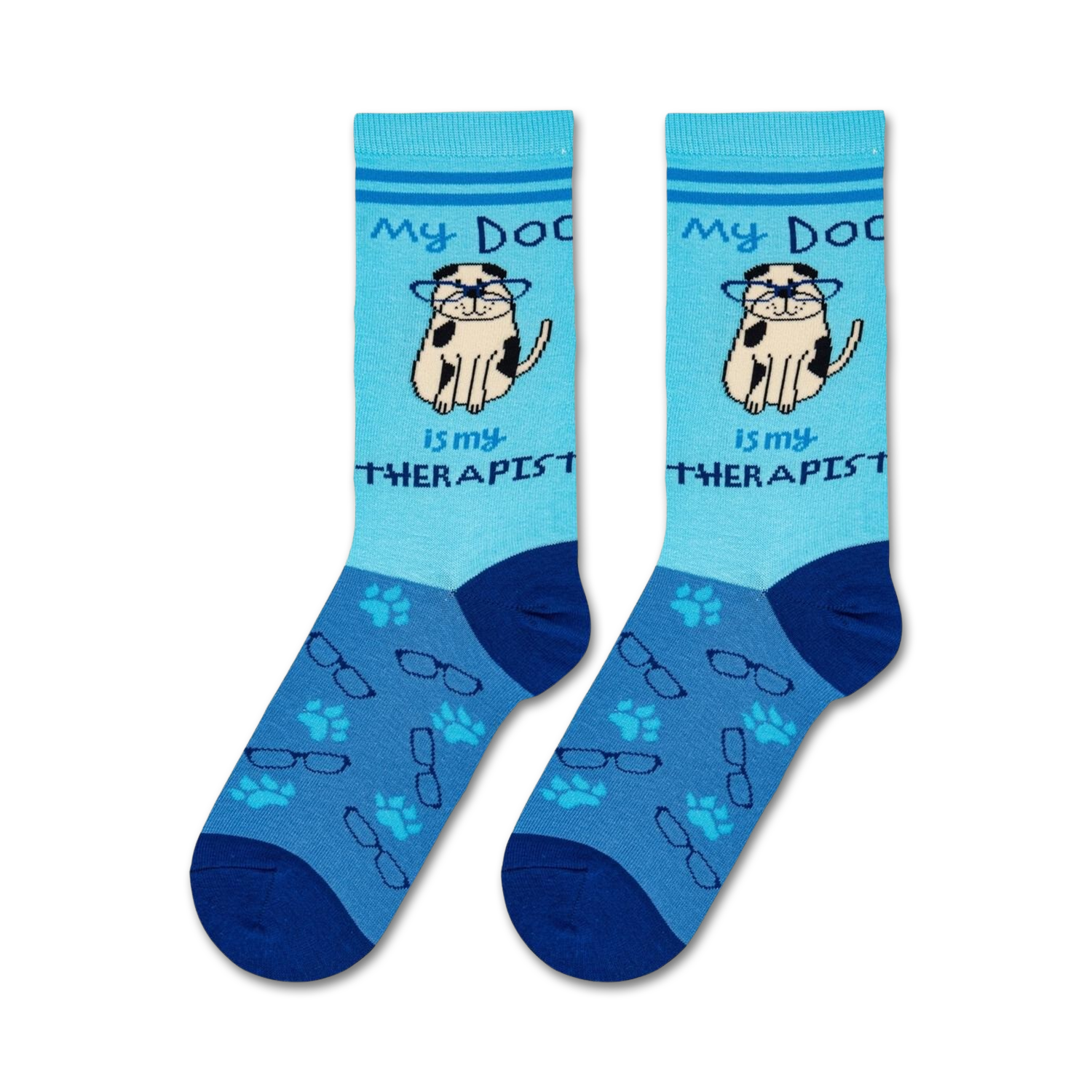 Have a paw-some day with our "Dog Therapist" socks! These crew-length socks in women's sizes feature a pawsitively delightful pattern of eyeglasses and paw prints. And the best part? They're emblazoned with the phrase "My Dog Is My Therapist" in a playful light blue and dark blue font. Wear these socks next time you and your furry friend hit the park or curl up on the couch for a movie. Remember, a dog's love can heal the sole. ;)