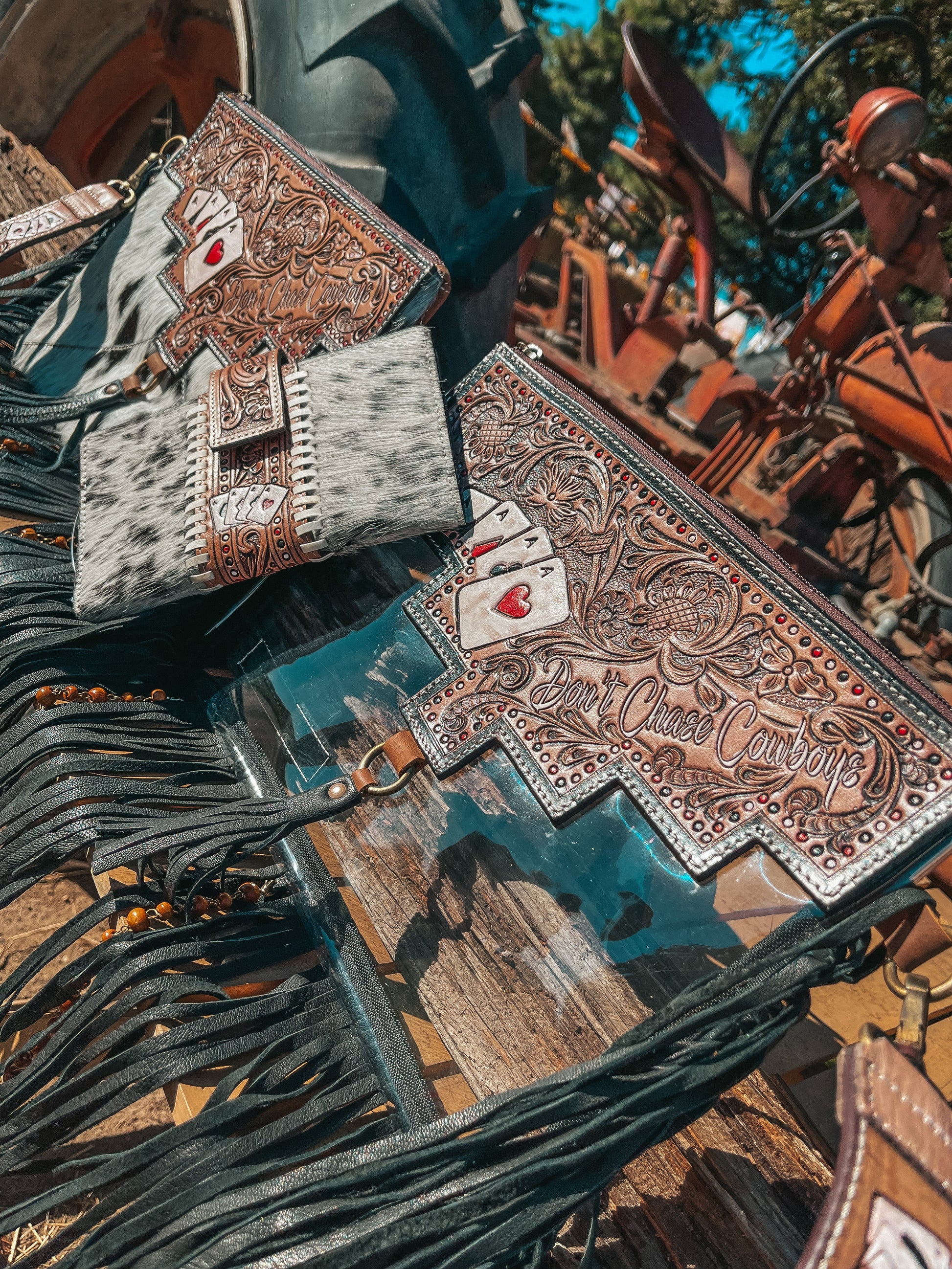 Event bags aren’t fun, but not yours! Yours is going to steal the show. Y’all know I had to bring you the iconic Don't Chase Cowboys bag in the clear bag version. I honestly don’t know which I love better!
