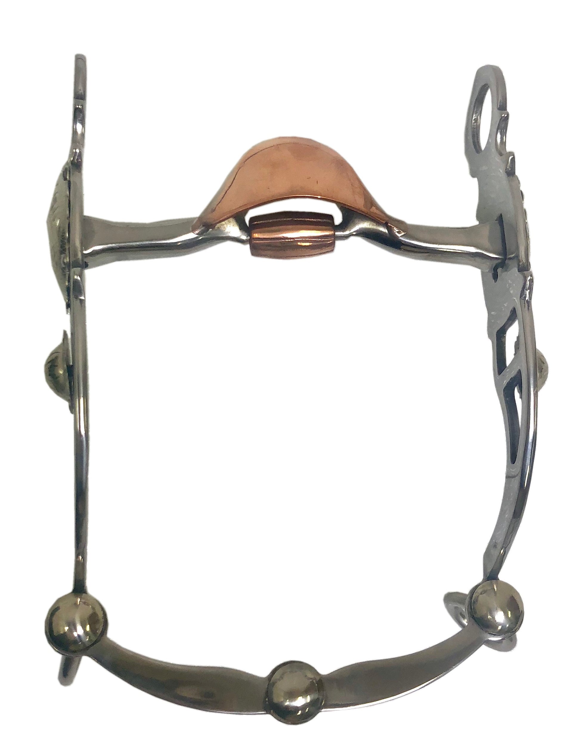 The Engraved Flower Show Bit is beautiful and of the highest quality. It has a high copper port with a copper roller, which is perfect for nervous horses. The shanks have hand engraved features. This is one fine bit.