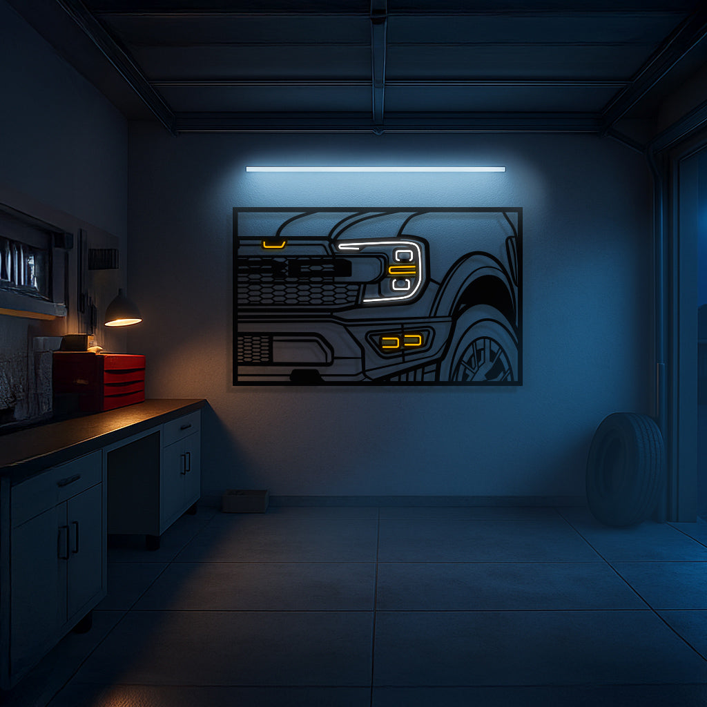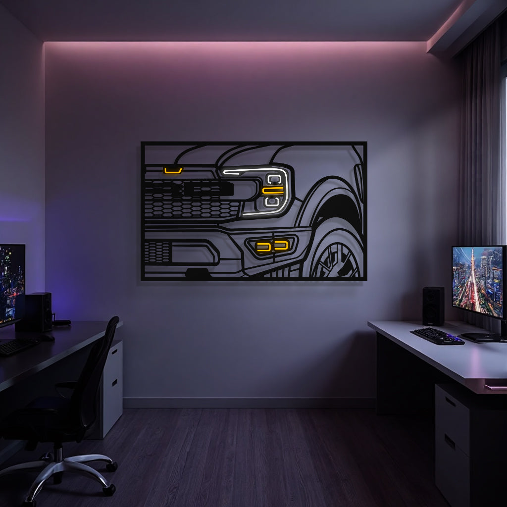 This 2021 F150 Raptor 3rd Gen Apex Front View Metal Neon Frame Wall Art will turn any car enthusiast's home, garage, hallway, living room, bedroom, or office into a unique space, add a stylistic look and captivate petrolheads as well as visitors.