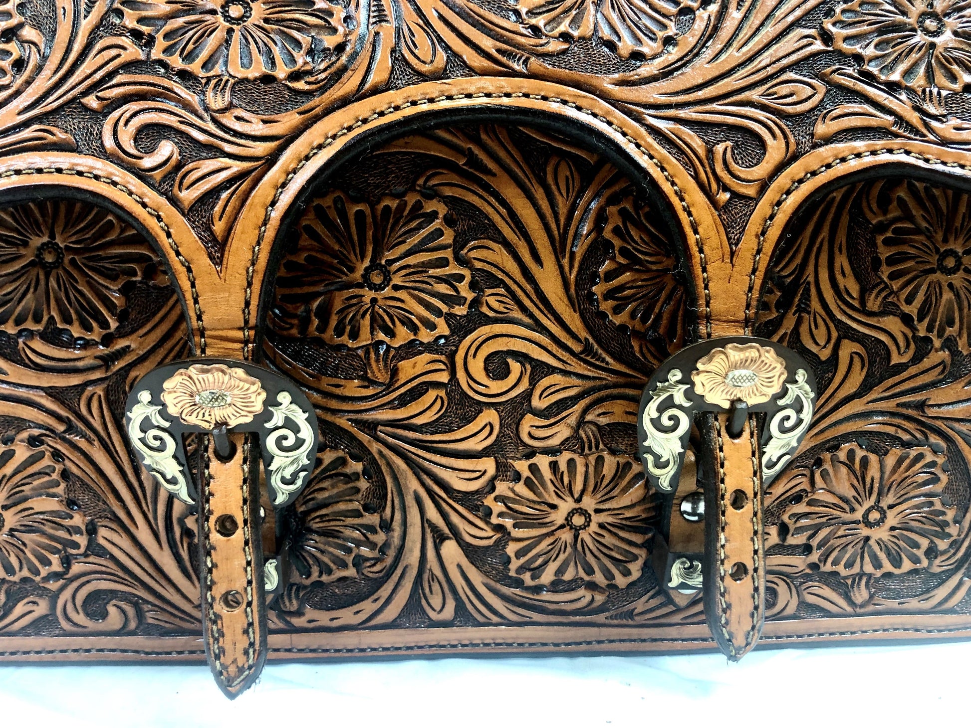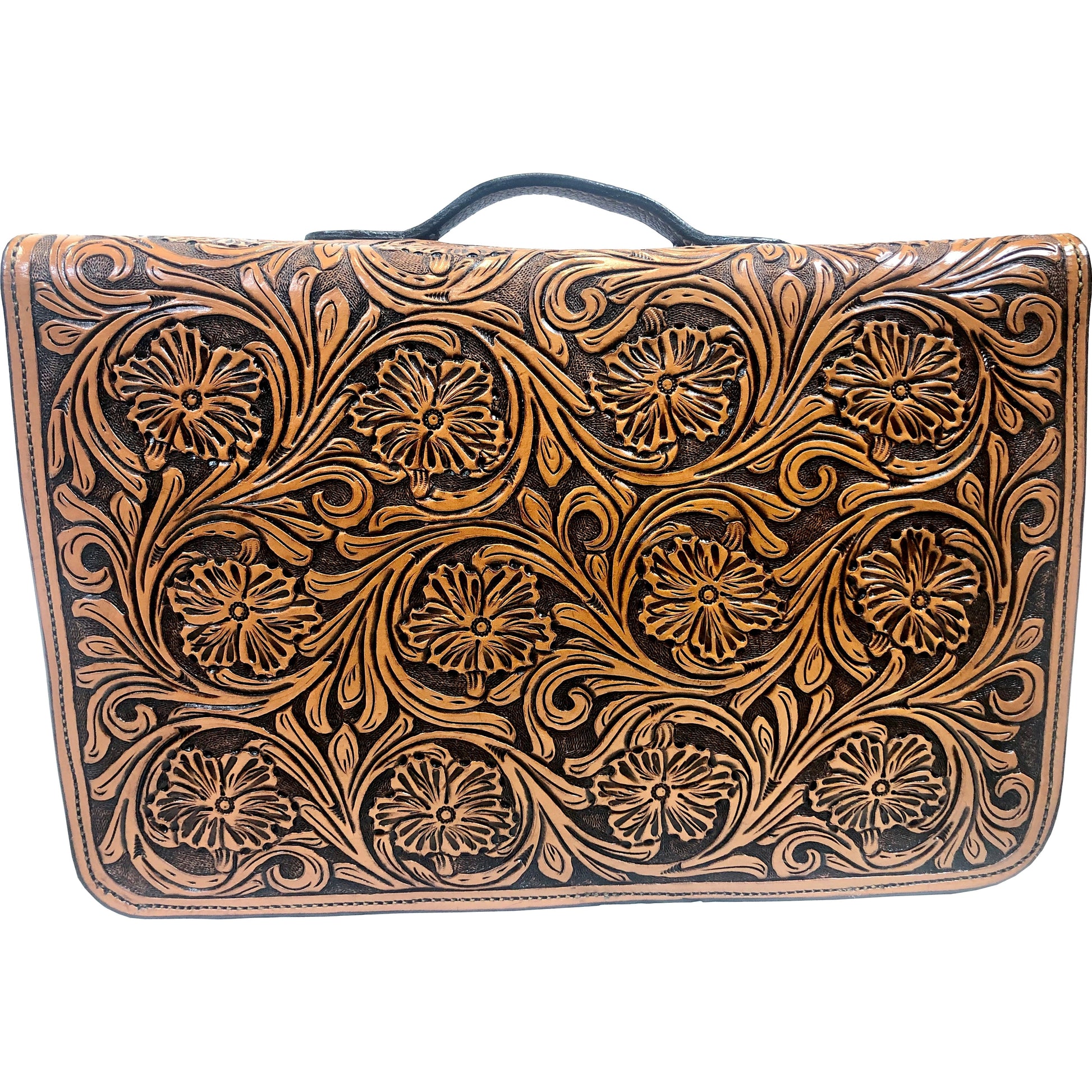 This briefcase is stunning. It is meticulously crafted with a hand tooled floral print, pro series buckles & cow hide accents on each side. It comes with a tooled strap and can hold all of your essentials. Laptops, notebooks- this briefcase is solid.