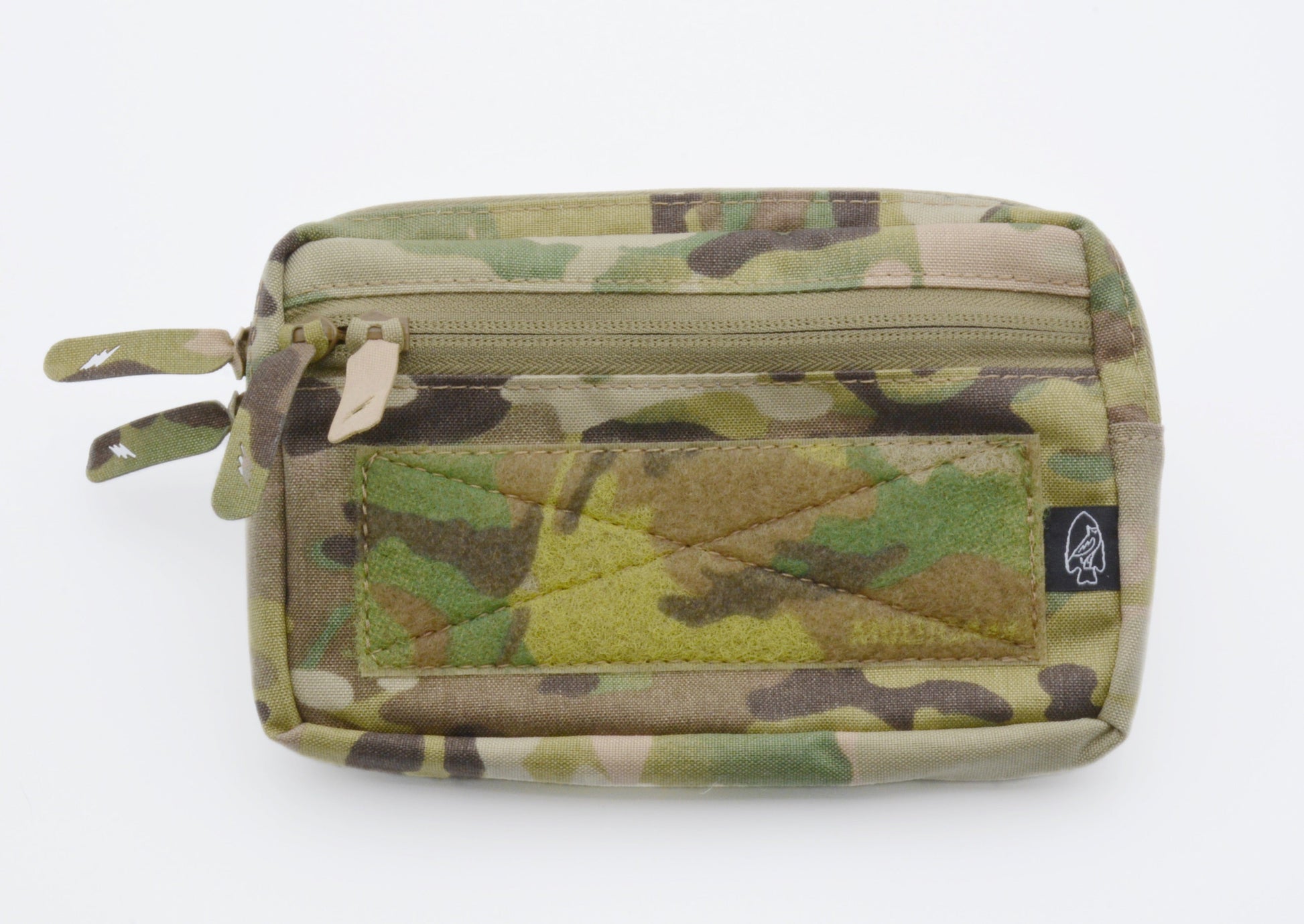 This is a very slim pouch made with 500D Cordura. It features reverse YKK zipper pulls on both the main and front pockets, and loop tape on both the front and back interior of the main pouch to accommodate battery and other organizational inserts.