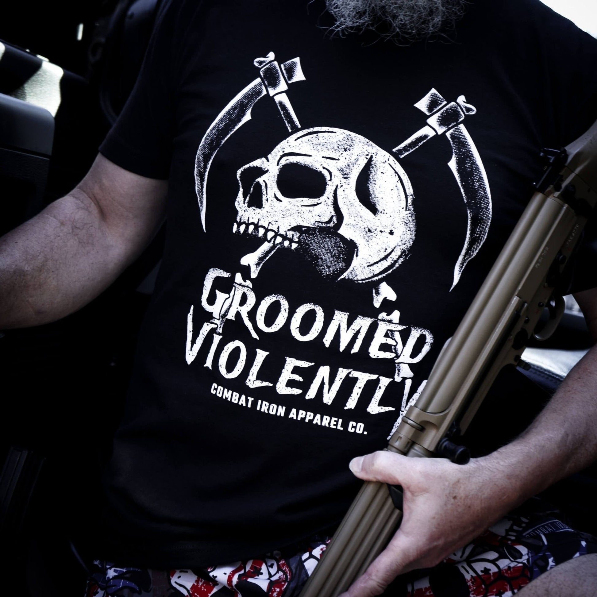 Hardcore distressed printed skull design on the front with GROOMED VIOLENTLY.