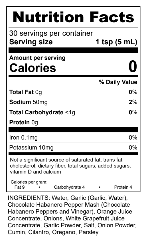 Ingredients: Water, Garlic (Garlic, Water), Chocolate Habanero Pepper Mash (Chocolate Habanero Peppers and Vinegar), Orange Juice Concentrate, Onions, White Grapefruit Juice Concentrate, Garlic Powder, Salt, Onion Powder, Cumin, Cilantro, Oregano, Parsley