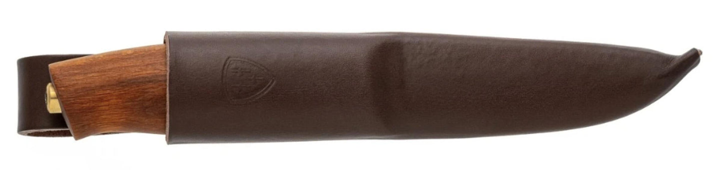 The Helle Skog is named after the Scandinavian word for forest and was developed for evenings by the campfire. This is considered a carving knife but is much more robust than the typical carving knives making it great for many tasks and chores. I would feel more than comfortable using this knife for my every day carry. The triple laminated stainless blade is short enough for complete control. The beechwood handle offers a comfortable grip for long sessions. This knife comes with a genuine leather sheath as pictured.