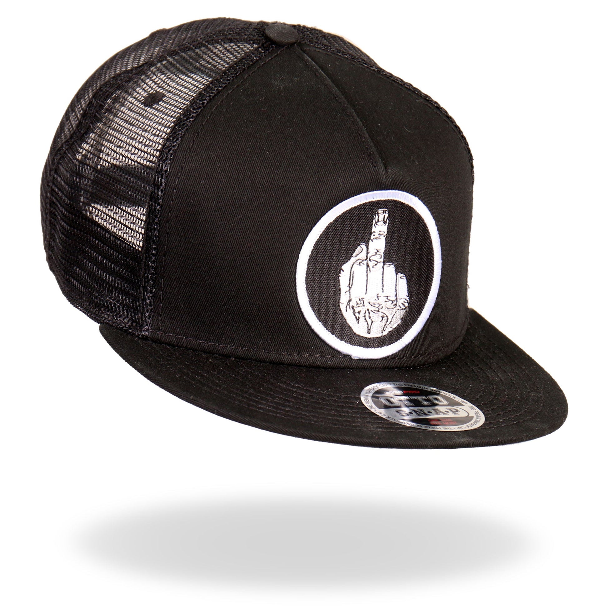 Hot Leathers Snap Back Hat. We use Otto Brand for our hat collection. This is the best snap back flat brim hat in the industry. Its a cotton/polyester blend helps the hat hold its shape for long time use. It is a mesh style back hat with a plastic adjustable tab and features a great Hot Leathers art patch.