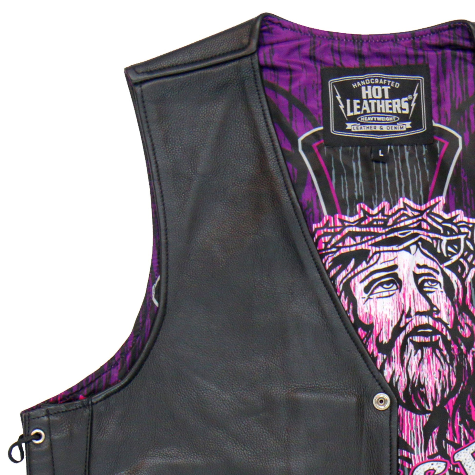 Front V-Neck and 4 snap front. It has front convenience pockets and inner extra large gun pockets. The lining is Hot leathers original art . The back has an extra 2" of length , so it will not ride up when you ride. Under this extra length , it is backed by more leather. The side laces offer extra room if necessary , and are tied with heavy rawhide laces. Heavyweight quality inside and out on this vest.