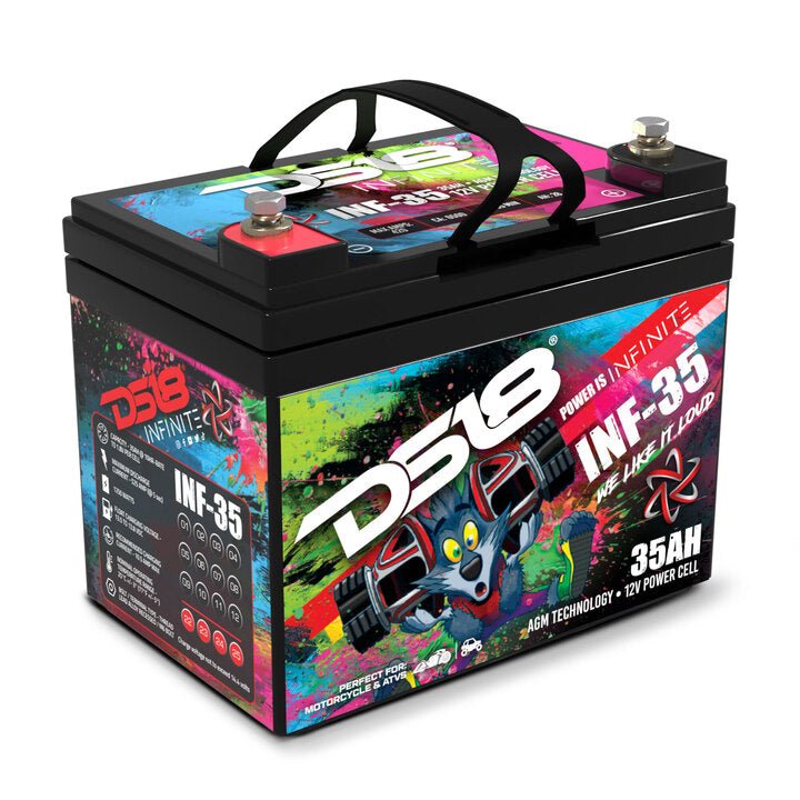 DS18 Infinite AGM power-cell batteries are what real enthusiasts need for all their charging system needs. These batteries have been proven tough and able to withstand extreme amperage draws and hold strong voltage through the most demanding of times. This AGM (absorbed glass mat) technology has proven through the years to be the most cost effective way to meet high charging demands from any 12v sources. Packed in a durable container, this battery is sure to stand the test of time. These batteries have a higher than normal float voltage so with the vehicle on and the alternator charging these will give even more reserve.
