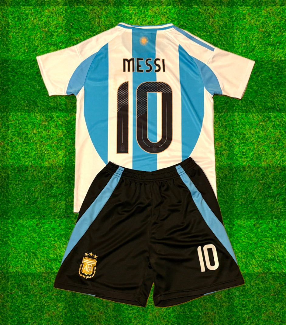 Kids Messi Jersey Kit - Argentina Black Shorts Version Soccer Jersey Set 2 Pieces Jersey & Shorts in Black. Toddler & Youth Sizes available. Awesome Youth Soccer Jersey and shorts set of 2. Size 2T, 3T, 4T, 5T, Extra Small, Small, Medium, Large, Extra Large, 18, 20, 22, 24, 26, 28, 30. All in stock ships within 12 hours from order time. We ship from Missouri. All soccer jerseys are brand new and never tried on. Amazing Screen Printing & Embroidery.