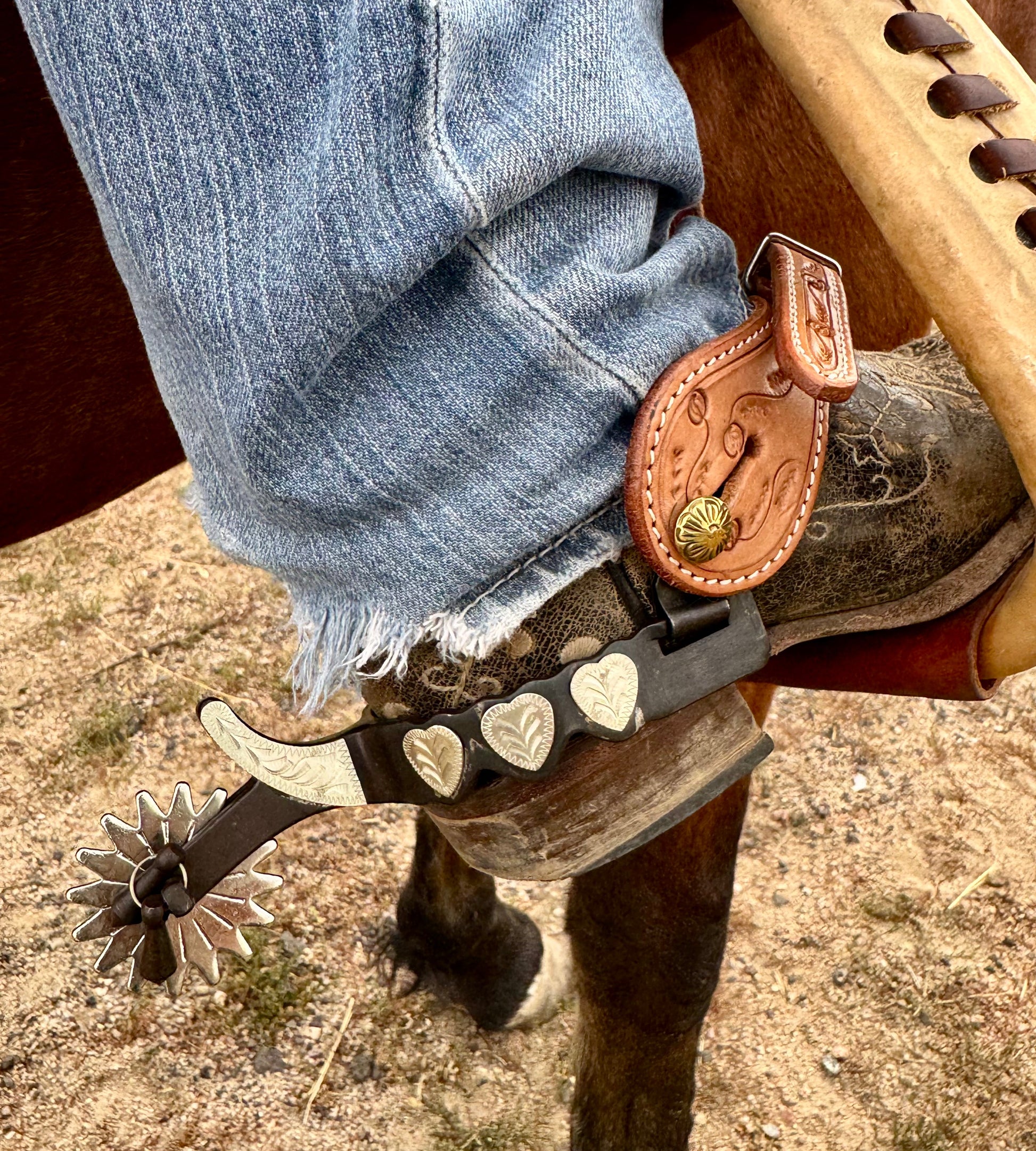 Add a touch of charm to your ride with the Ladies' Romero Heart Spurs. Crafted from midnight blue steel, these spurs feature a 2" heart-shaped band and engraved nickel silver heart overlays for a stylish, feminine look. Durable stainless steel rowels with jingle bobs ensure effective cues while riding.