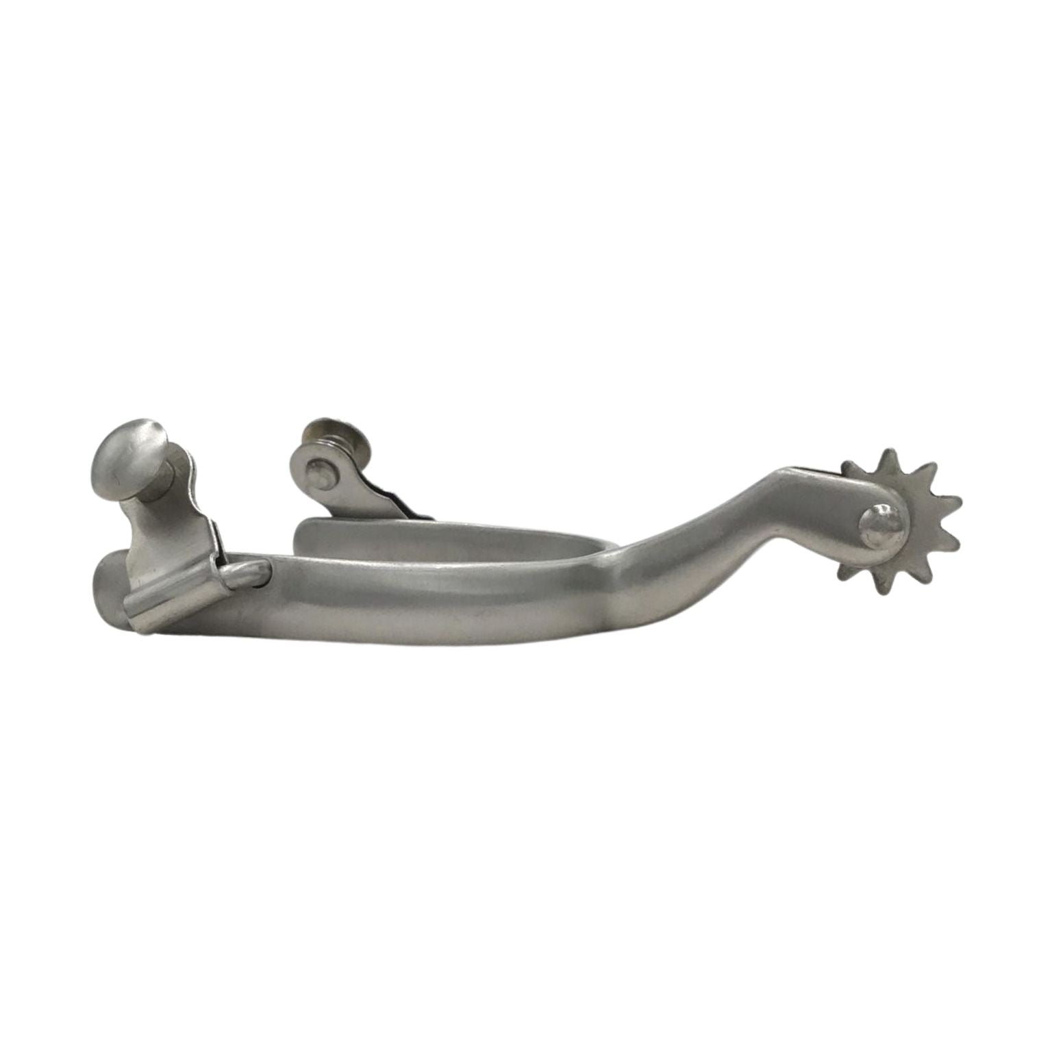 A beautiful, brushed steel, lady's roping spur with gooseneck shank, 7/8" ten-point rowels and swinging buttons. Made to fit a boot comfortably.