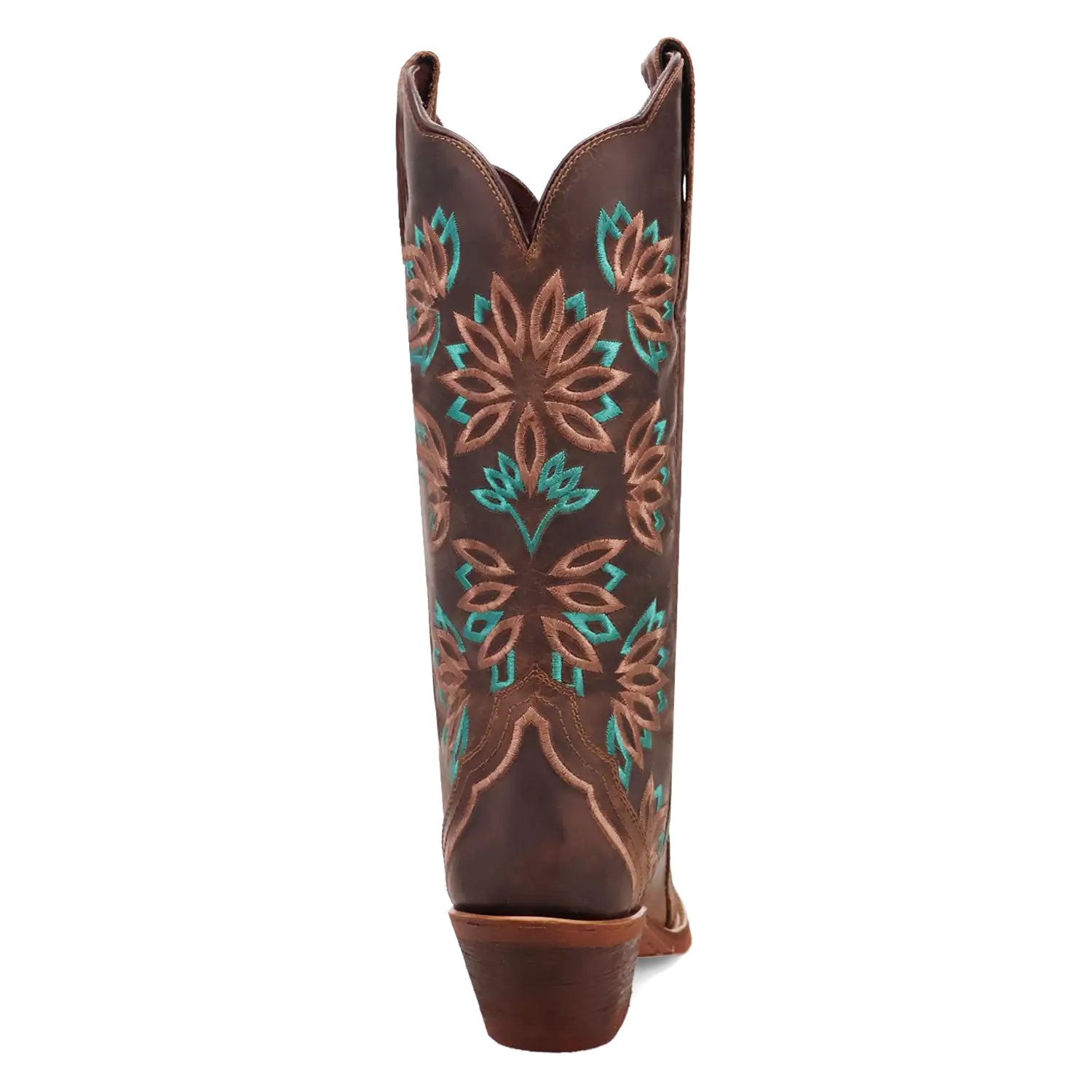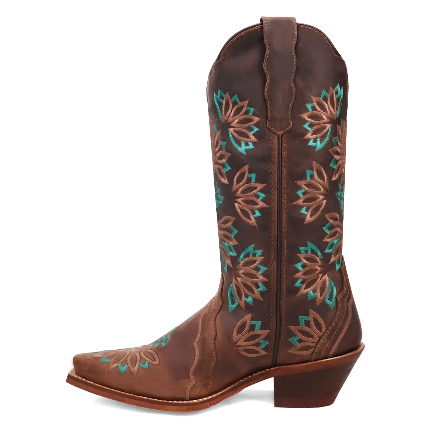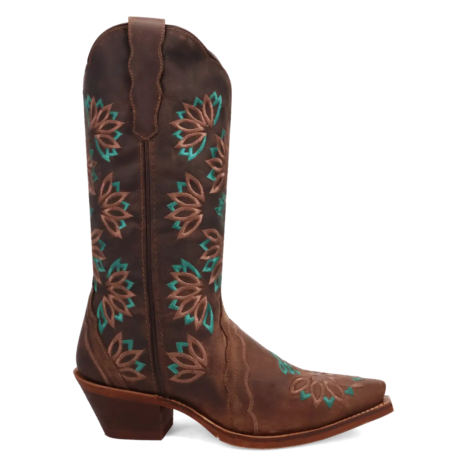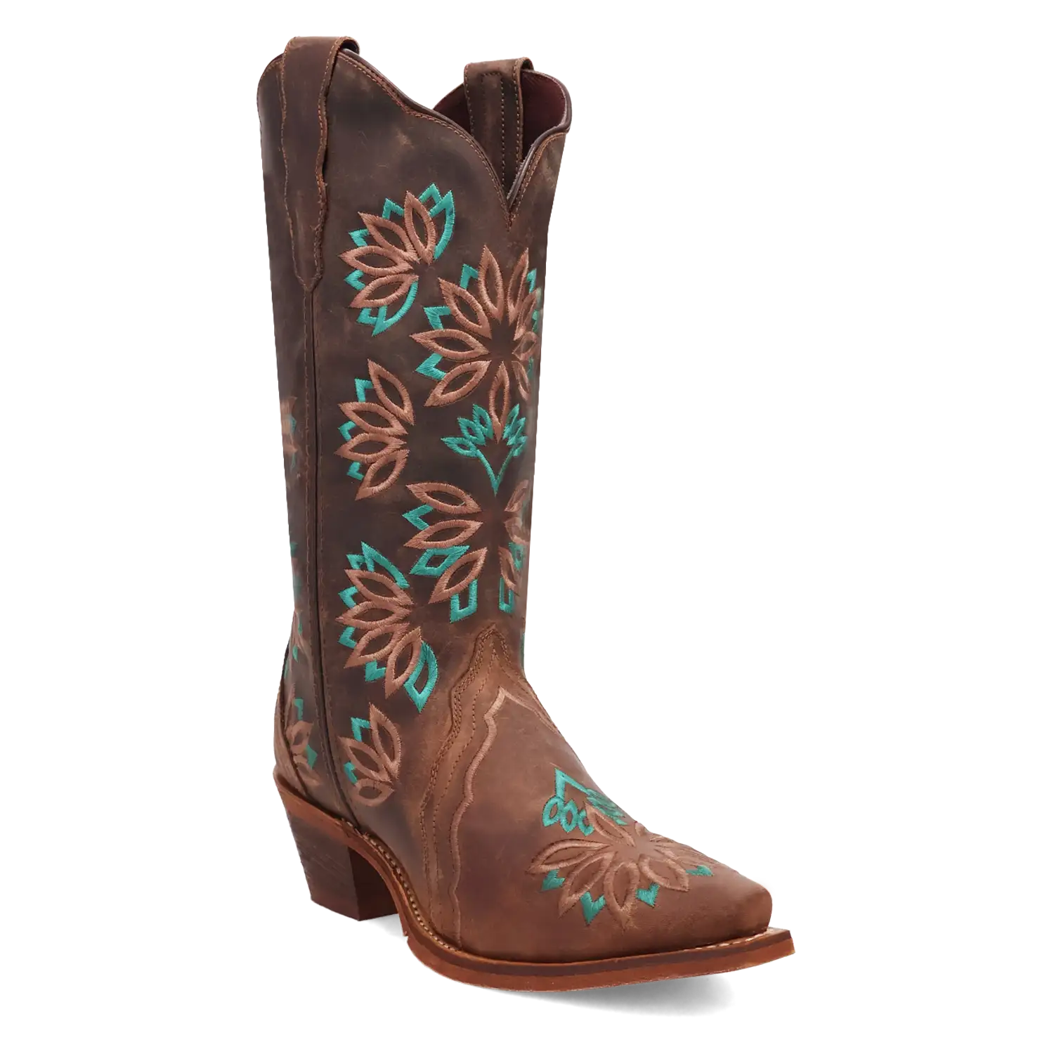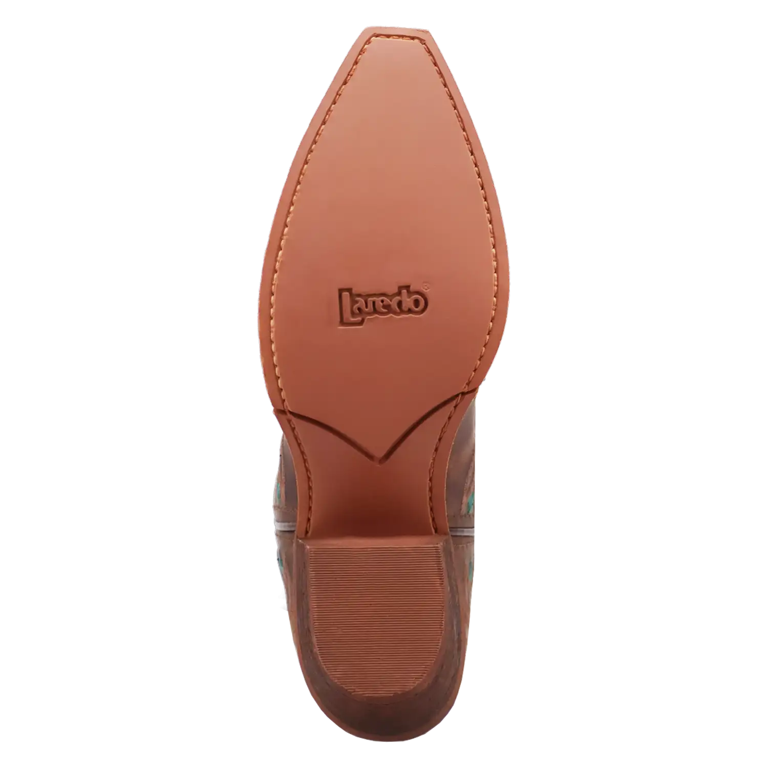 The shaft of the boot is beautifully adorned with floral embroidery in brown and turquoise, creating a stunning contrast that’s sure to turn heads. With its cushion comfort insole, this boot offers long-lasting support, while the Laredo Flex rubber outsole ensures steady traction and durability.
