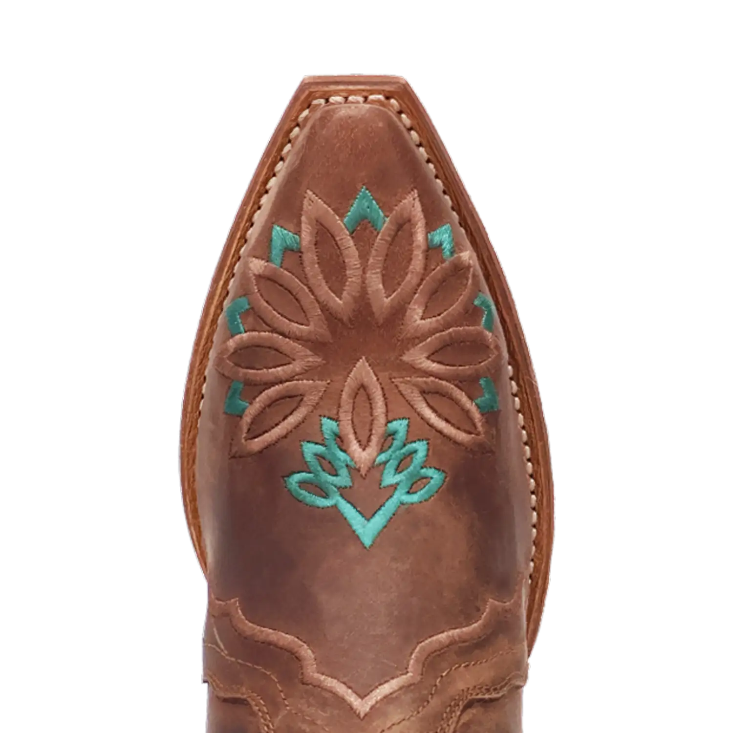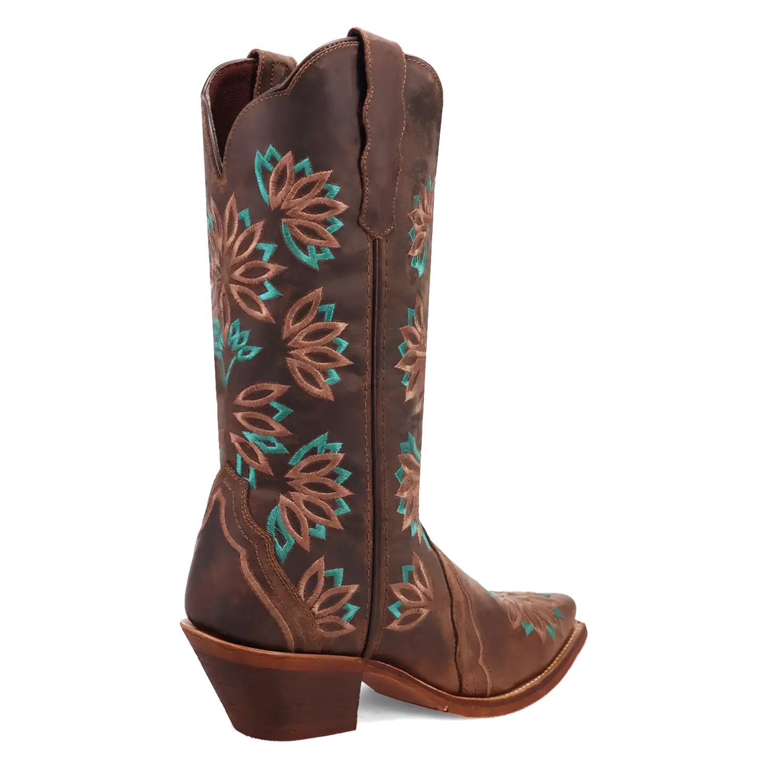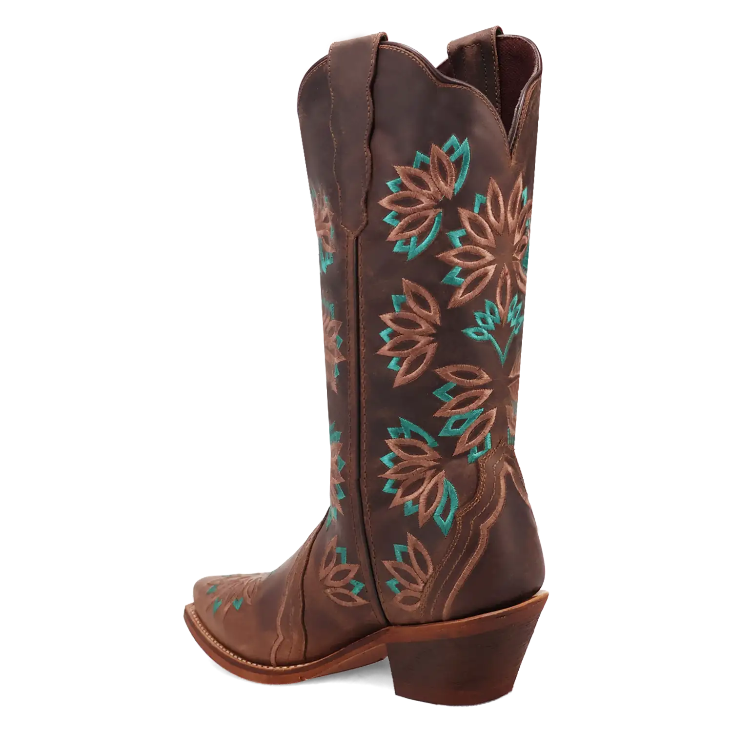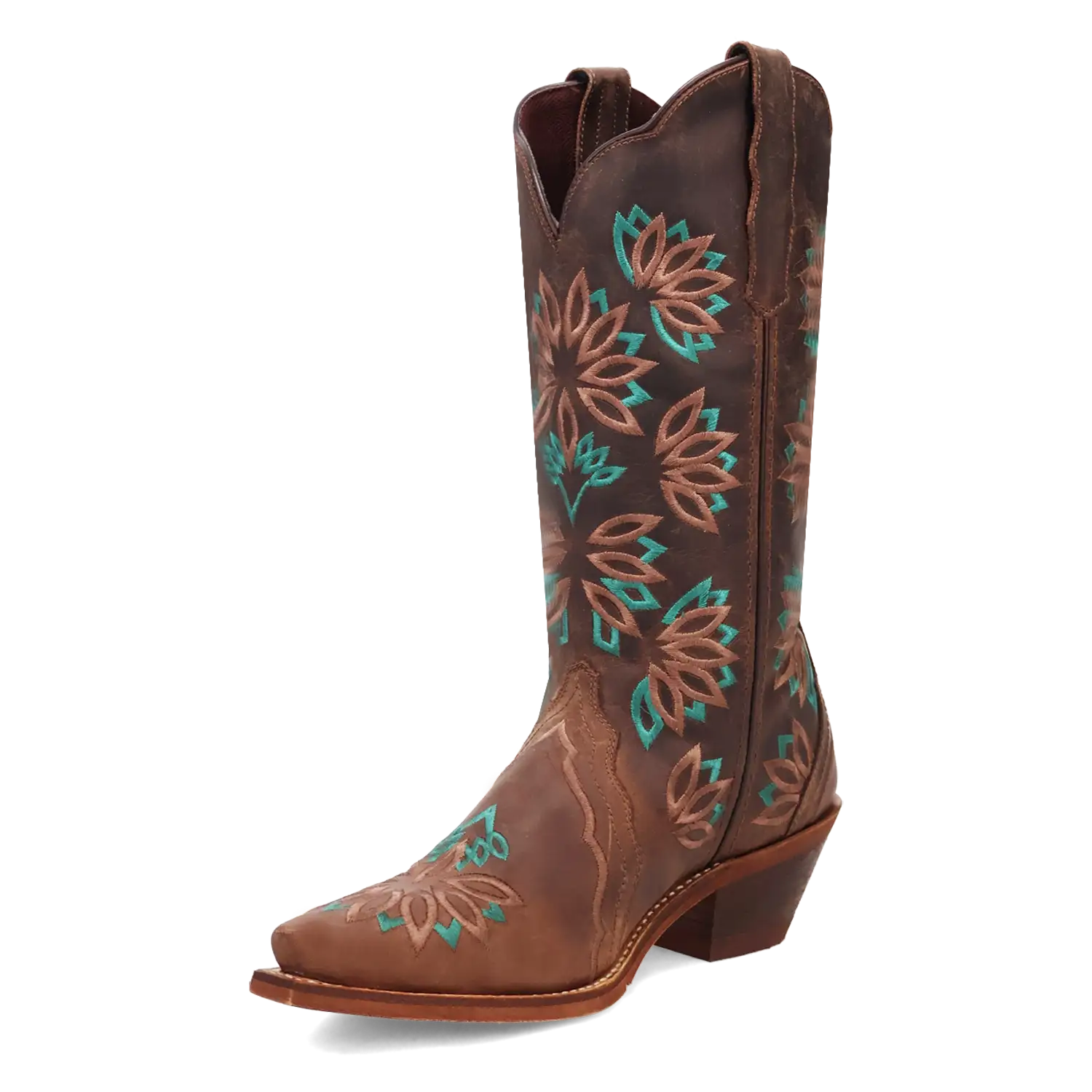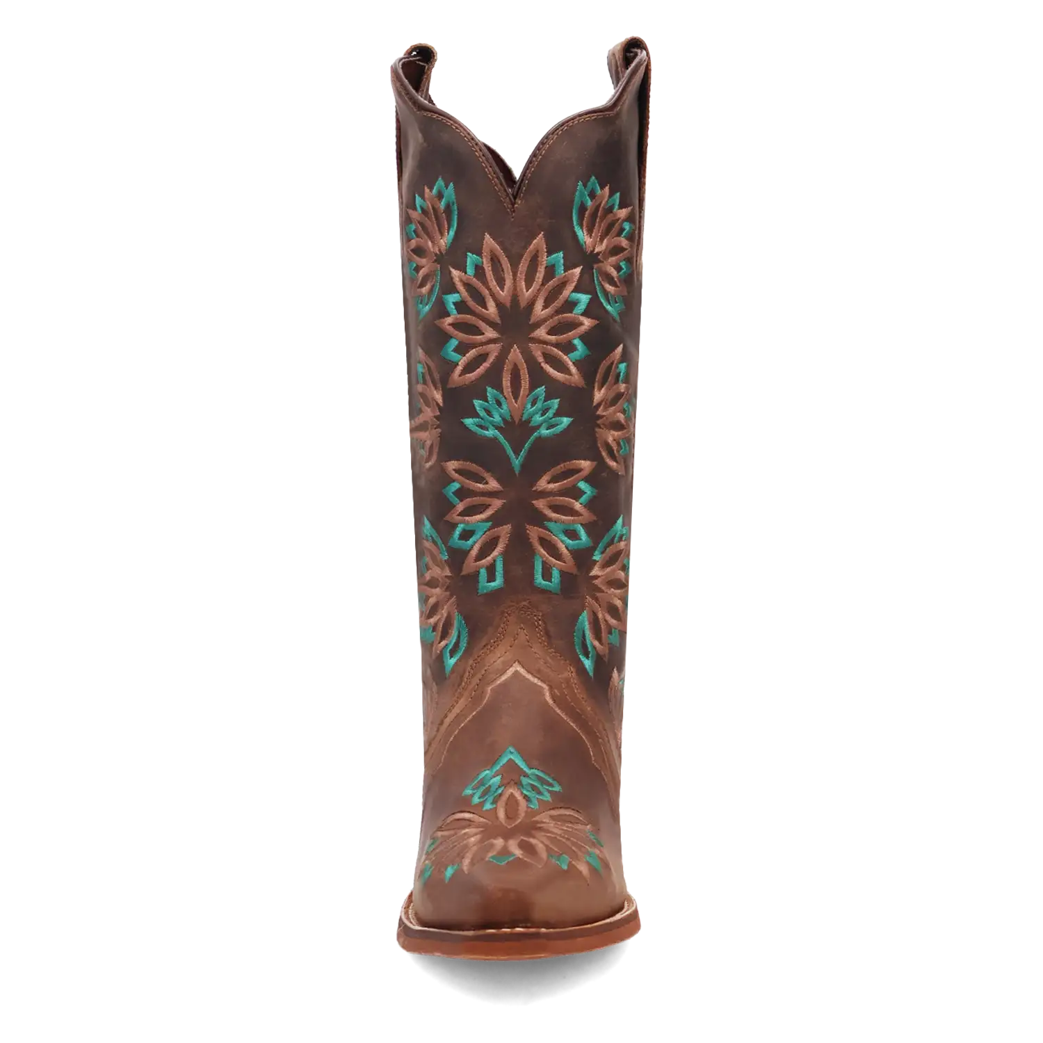 The shaft of the boot is beautifully adorned with floral embroidery in brown and turquoise, creating a stunning contrast that’s sure to turn heads. With its cushion comfort insole, this boot offers long-lasting support, while the Laredo Flex rubber outsole ensures steady traction and durability.