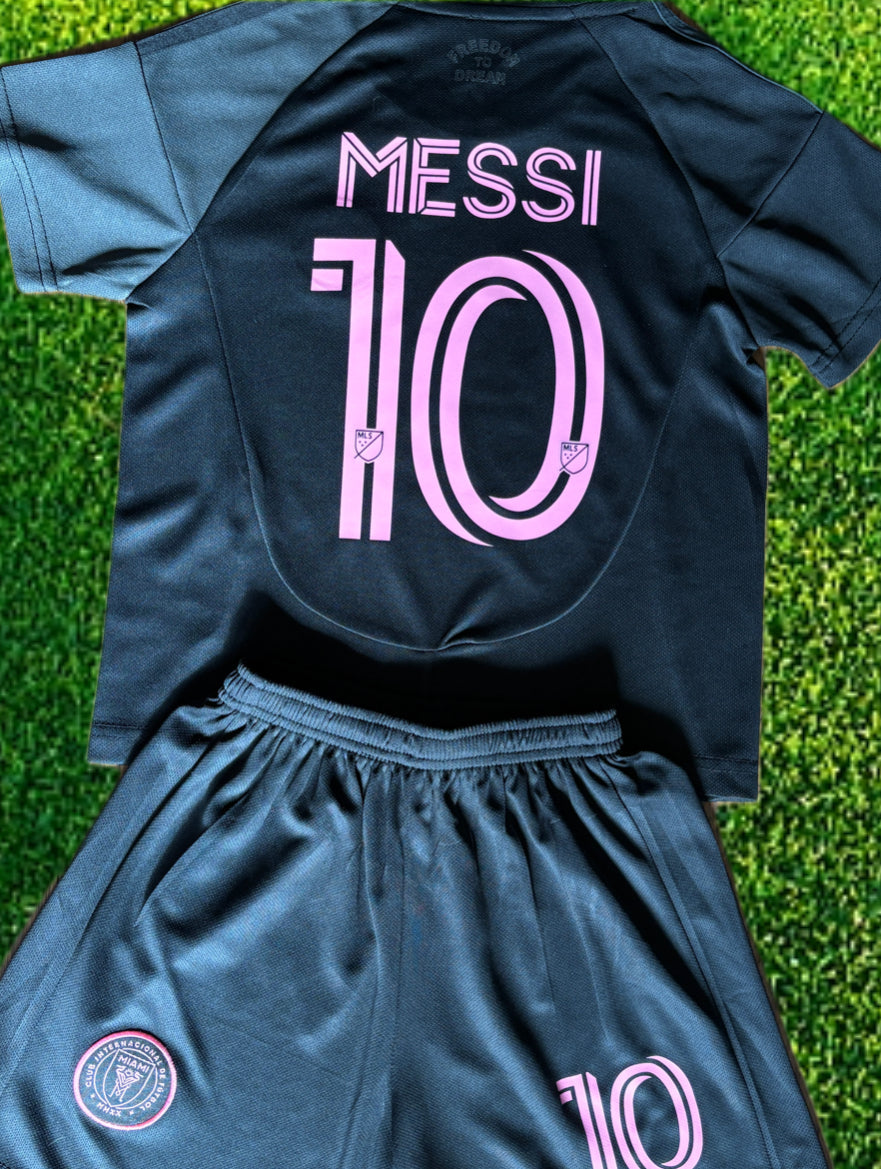 Lionel Messi Kids Soccer Jersey Miami Soccer 2025 away Black Set Football Youth Toddler Sizes. Futbol Youth Toddler Football Shirt and Shorts matching set. Toddler Youth Tshirt Awesome Youth Soccer Jersey and shorts set of 2. Size 2T, 3T, 4T, 5T, Extra Small, Small, Medium, Large, Extra Large, 18, 20, 22, 24, 26, 28, 30. All in stock ships within 12 hours from order time. We ship from Missouri. All soccer jerseys are brand new and never tried on. Amazing Screen Printing & Embroidery.