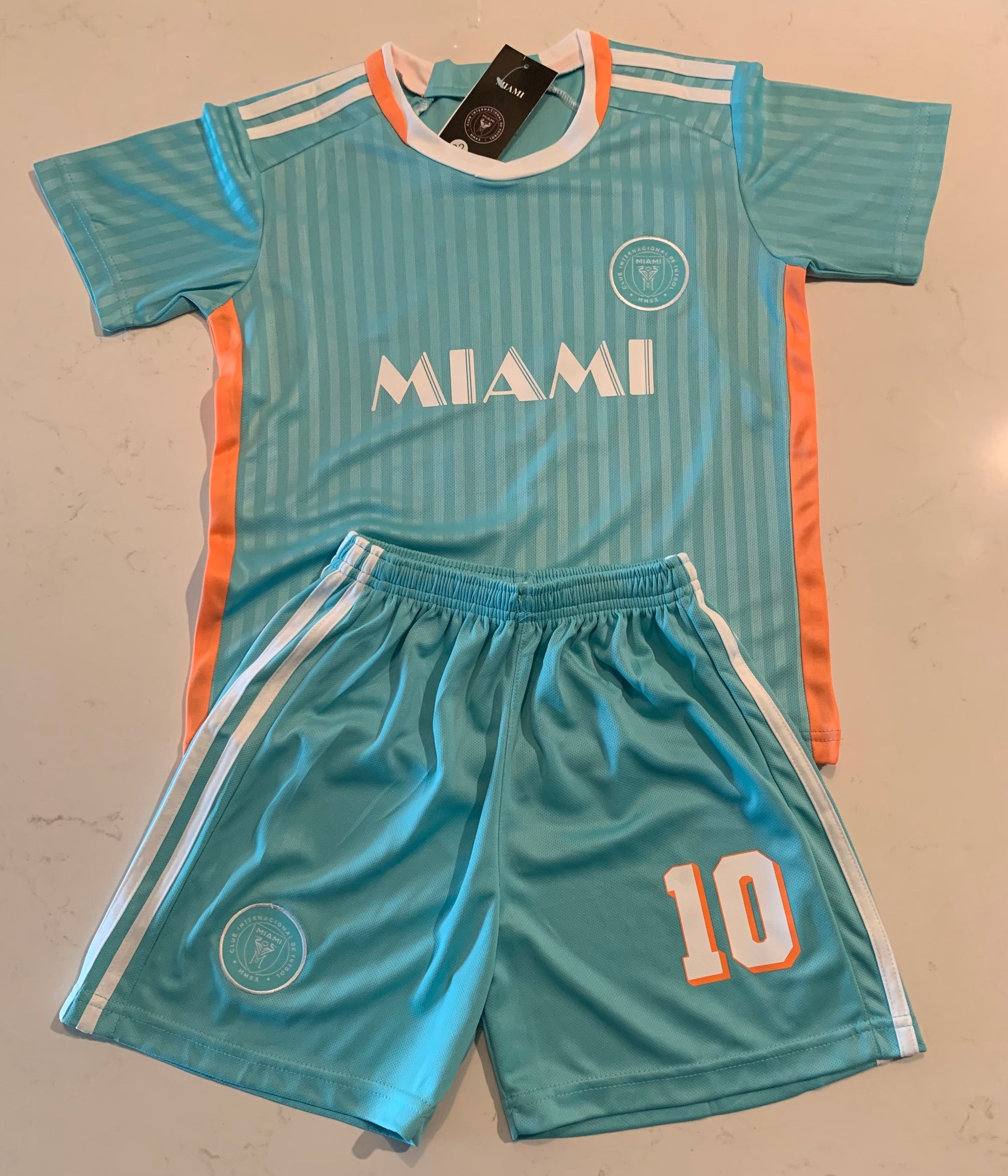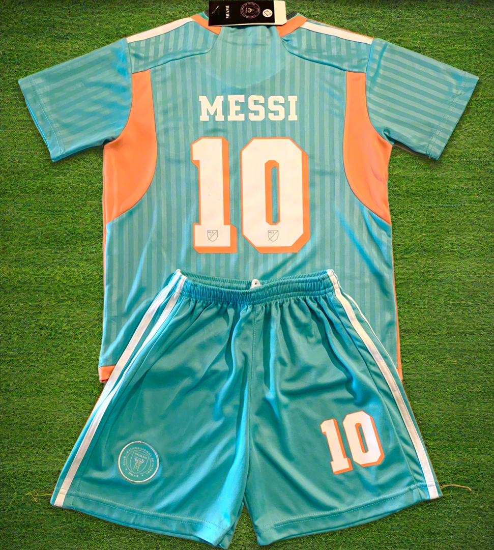 Lionel Messi Inter Miami 3rd Soccer Jersey Kit. Brand New! Futbol Youth Toddler Football Shirt and Shorts matching set. Toddler Youth Tshirt Awesome Youth Soccer Jersey and shorts set of 2. Size 2T, 3T, 4T, 5T, Extra Small, Small, Medium, Large, Extra Large, 18, 20, 22, 24, 26, 28, 30. All in stock ships within 12 hours from order time. We ship from Missouri. All soccer jerseys are brand new and never tried on. Amazing Screen Printing & Embroidery.