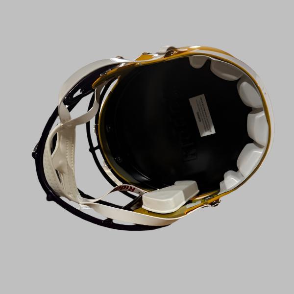 LSU Tigers Full Size Speed Replica NCAA Helmet by Riddell. This full size LSU helmet is designed with a non-wear plate and molded foam jaw pads. a steel polyvinyl-coated face mask, 4-pt chin strap, and elliptical air vents. This officially licensed NCAA helmet is great for autographs and features LSU team logo decals on both sides. The striking shape of the future. NCAA LSU Replica Speed helmet size medium measures: 12.75"(L), 9.25"(W), 9.75"(H). NCAA LSU Tigers Full Size Speed Replica Helmet. (NOT FOR WEARING)