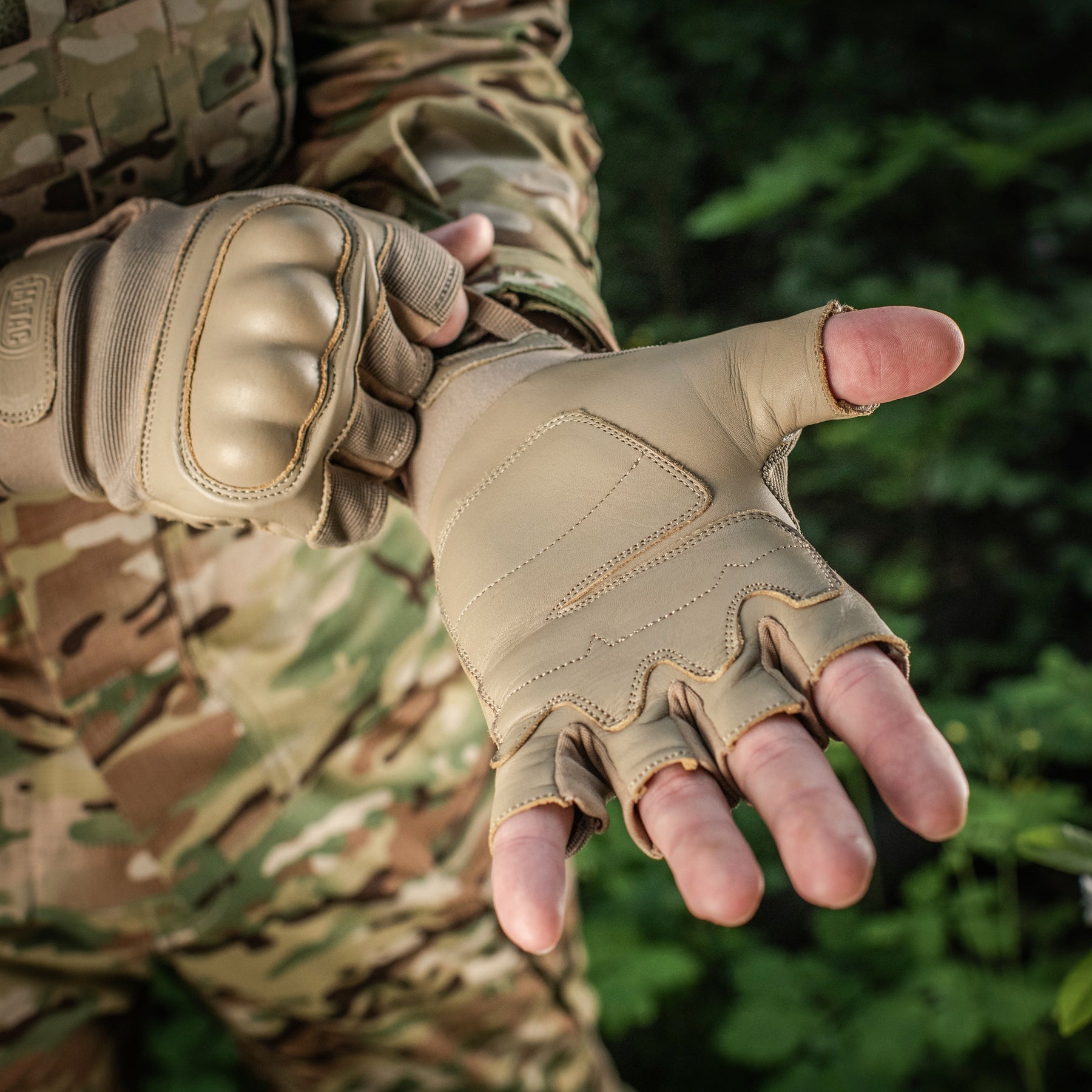 The M-Tac tactical all-purpose fingerless gloves Assault Tactical Mk.4 are designed for a muliporpose use. This model has a reinforced palm pad made of genuine leather that will prevent severe injuries and bruises during falls, and prevent slipping even when wet. The gloves feature damping pads over knuckles. They feature heavy-duty molded knuckle plates to ensure maximum protection and comfort. The knuckle plates are also designed to be flexible and breathable, so your hands stay cool and protected as you work or play. The cuff closes with hook and loop fastener, which creates additional comfort. These gloves will accompany and protect you while motorcycling, during a workout, in combat, or any other outdoor activity.
