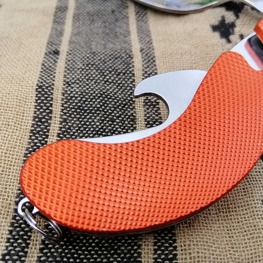 The functional and compact Folding Two-piece Cutlery Set. This single tool combines a cutlery set for 1 person - a spoon, a fork, and a folding knife. The set disassembles into stand-alone cutlery units for extra convenience. When you're done eating, it is easy to give it a rinse and snap the cutlery back together to avoid losing any parts. The lightweight material is durable, long lasting, and easy to store. Perfect for camping, hiking or hunting trips.