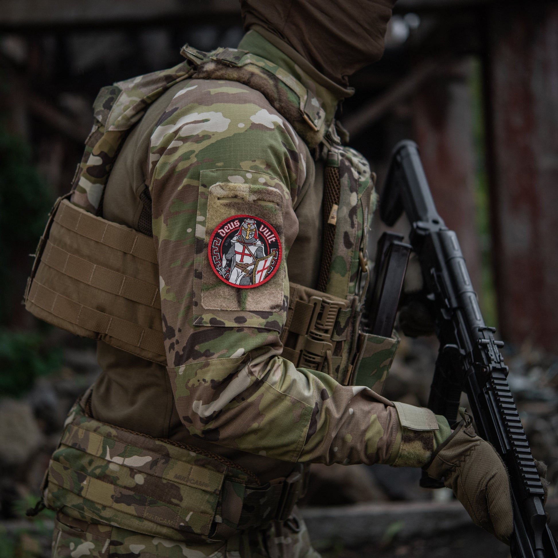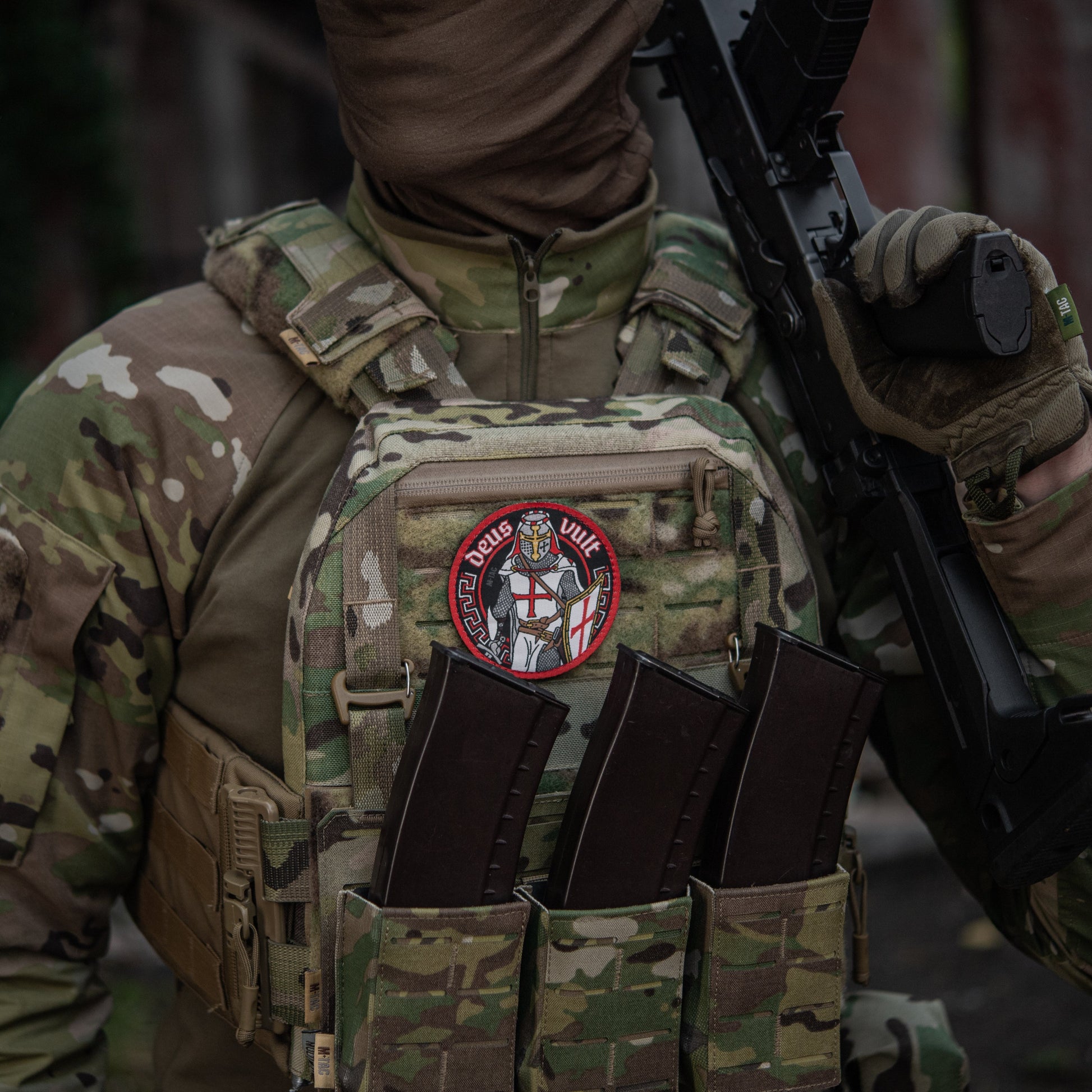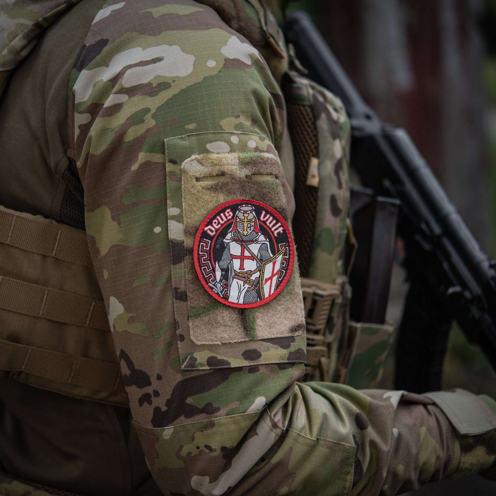 The Deus Vult patch by M-Tac. The inscription "Deus Vult" (can be translated from Latin as "God wants it"; in French: Dieu le veut) - it was the call of the people made during the proclamation of the first crusade by Pope Urban II. The patch contains an image of a knight-crusader in full ammunition: cloak and shield with a cross, scabbard for the sword, helmet, chain mail and sword in the hand. It is made using jacquard weaving technology (woven from threads like a carpet). Such a patch will be an excellent addition to clothes, and will add individuality to a backpack, bag, cap and other equipment.