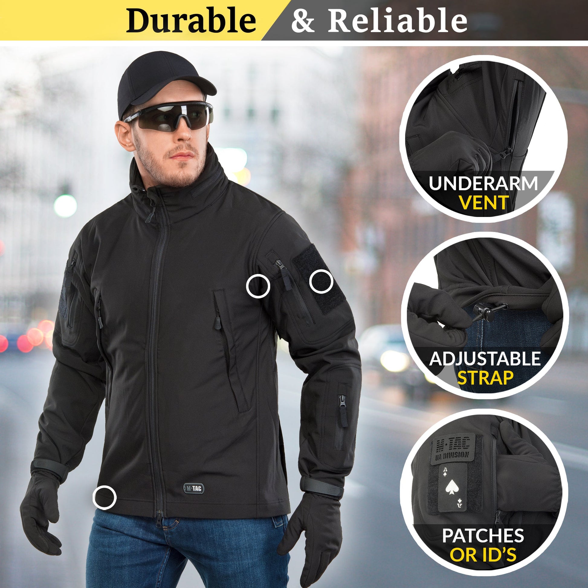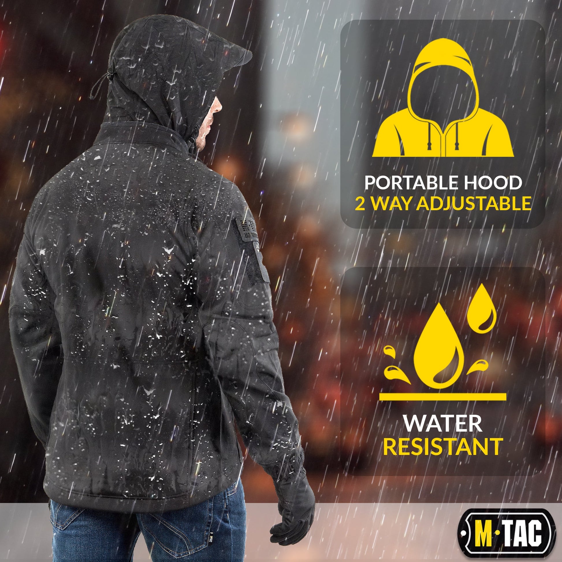 The M-Tac black Soft Shell Jacket for men is made of an interlayer polyurethane membrane that protects from bad weather. Inside, it has a thin fleece. The softshell products have several outstanding properties: their low weight and the combination of two layers of clothing in one. The softshell combines an outer layer (for protection from wind and weather) and an insulating inner layer. The top fabric is not only moisture-deflecting but also dirt-deflecting as well. Besides, the soft and streamlined material makes it more comfortable to wear. The front zipper is made by YKK. The zipper has high quality and performs its function without any problems. Due to the presence of a number of pockets, the military softshell jacket has increased functionality. Available two shoulder pockets, two inside pockets, two hand pockets, horizontal back pocket, forearm pocket. Axillary ventilation zippers improve thermoregulation. Elastic cord at the waist and adjustable wrist cuffs allow you to fit the jacket more comfortably on the body. And the compactly folded hood located at the back of the collar will always protect you from rain or snow. Side loop panels on the sleeves allows to wear various moral patches.