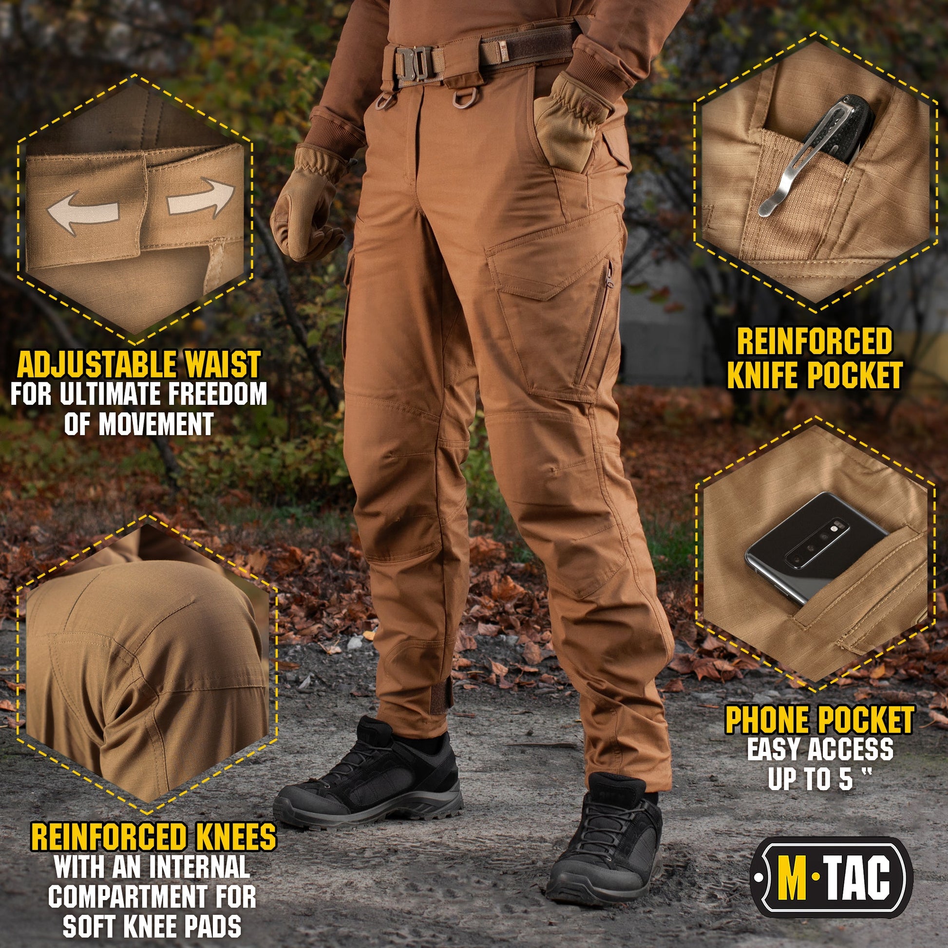 Pants create a feeling of lightness and look stylish and solid. Practical wide pockets with additional reinforcement in the most vulnerable areas to abrasion. Belt loops up to 2.2 inches wide. The front straps of tactical slacks are sewn with D-shaped plastic rings for attaching additional equipment. Zippers and buttons from the world leader in the production of accessories YKK. Aggressor Gen.II Flex Coyote Tactical pants from M-Tac are a successful combination of a well-thought-out cut, high quality, and wide functionality. Well-fitting trousers will provide you with proper comfort.