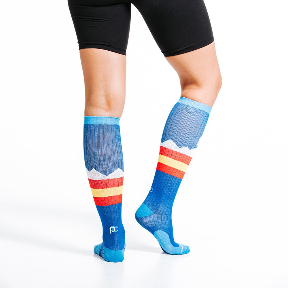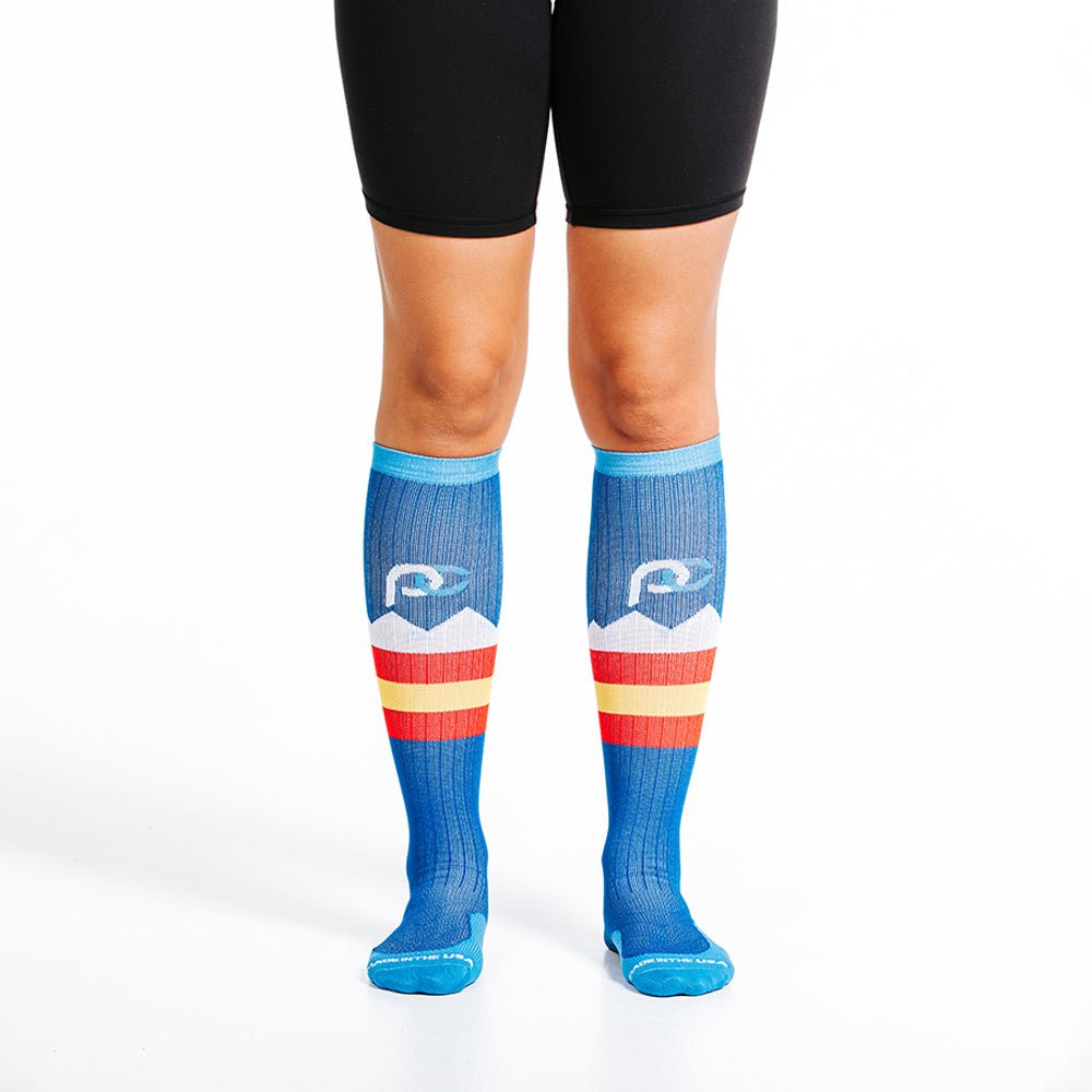 This knee-high Marathon sock offers true graduated compression, increases blood flow, and allows you to perform at your peak, recover faster and feel better sooner. Our advanced design supports critical muscles and tendons, and our proprietary blend of materials wicks moisture for a comfortable fit that goes the distance.