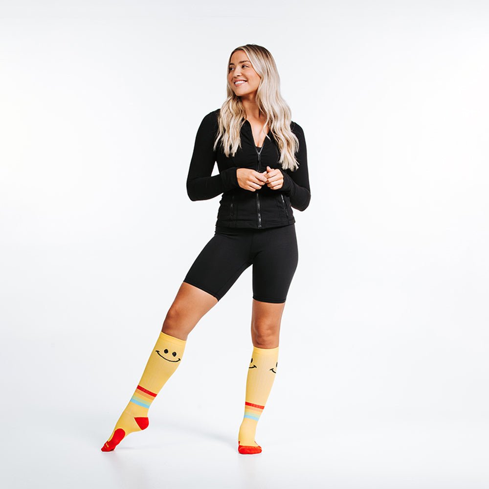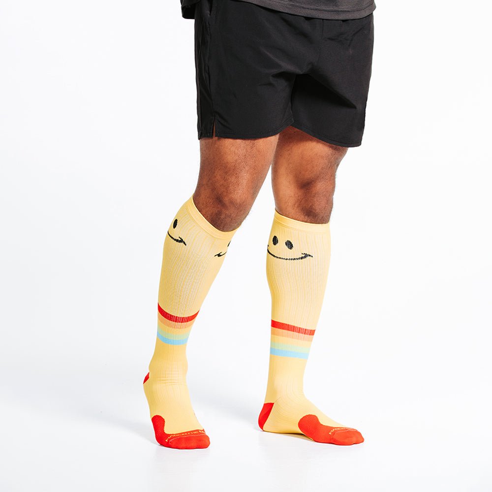 These rainbow-banded, colorful happy face socks are sure to turn heads. There's always a reason to smile with this pair! 😃 Now available in new Wide-Calf sizes.