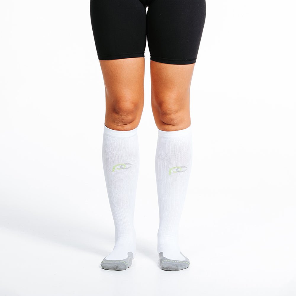 This knee-high Marathon sock offers true graduated compression, increases blood flow, and allows you to perform at your peak, recover faster and feel better sooner. Our advanced design supports critical muscles and tendons, and our proprietary blend of materials wicks moisture for a comfortable fit that goes the distance.