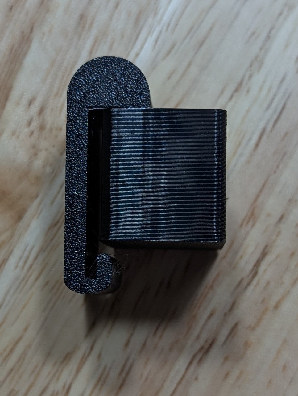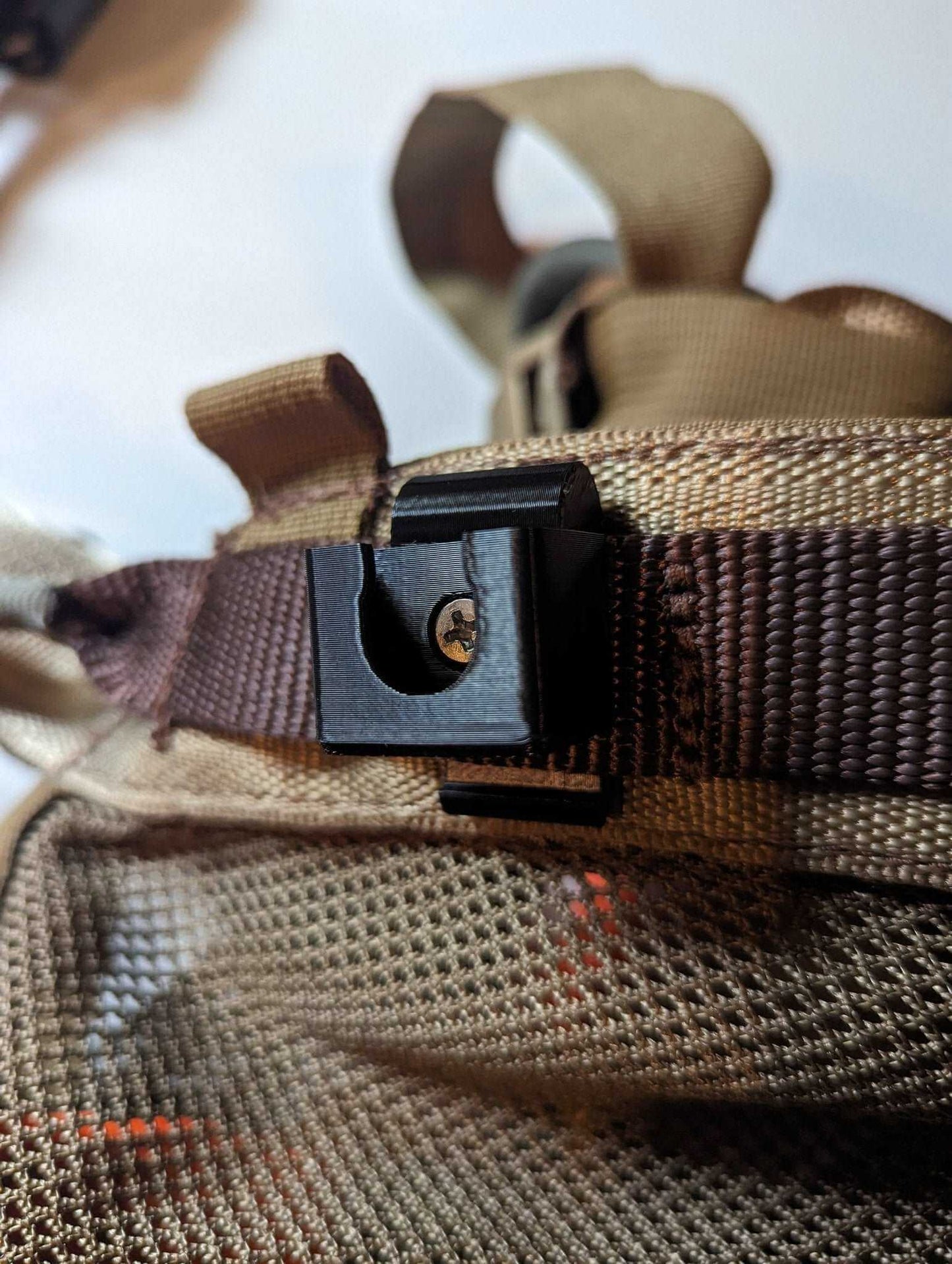 The button clicks in the caddy and can freely spin once in. The caddy can be used on your gear strap or on a molle strap on your pack or saddle. Two pieces held together with a stainless steel screw.