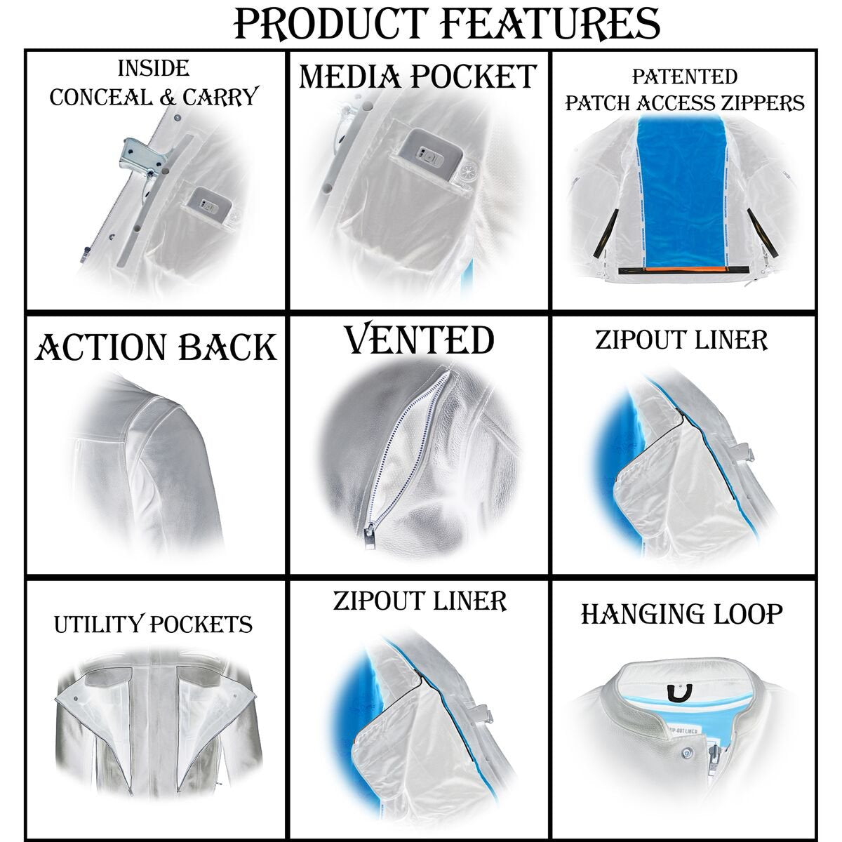 - Ventilation System : 2 Chest, 2 Arm and 2 Back Vents with Zipper Closure