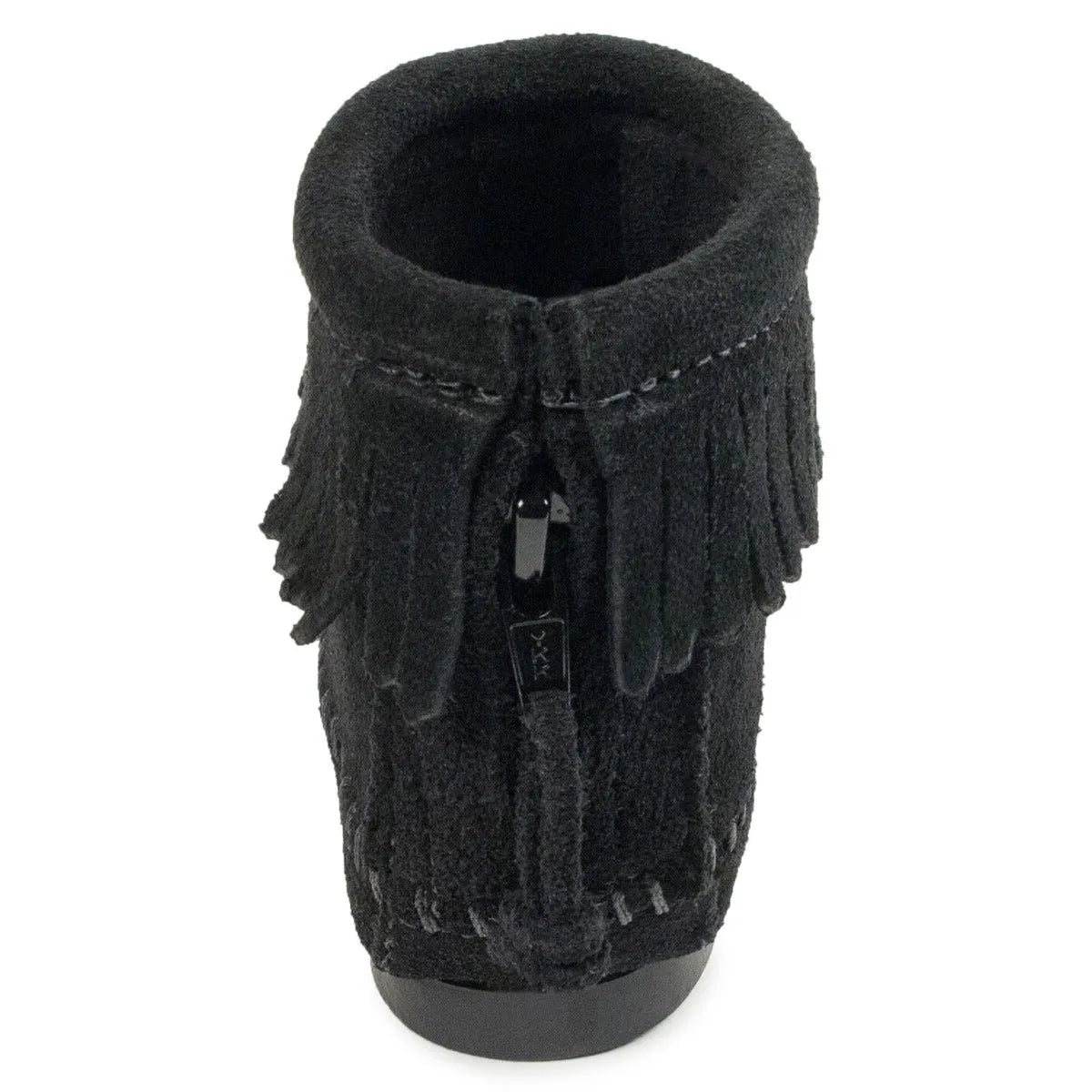 The Minnetonka Back Zipper Hardsole Boot Children's Boots offer a fusion of style and comfort, crafted with soft suede leather for a luxurious feel against the skin. A playful fringe ankle collar adds a touch of whimsy, enhancing the boot's appeal for young wearers. Bold stitching adorns the base of the boot, creating a striking contrast against the supple suede. Designed for comfort during all-day wear, these boots feature a padded insole that cushions each step, ensuring happy little feet. The thin rubber sole provides traction and durability, making them suitable for various indoor and outdoor activities.