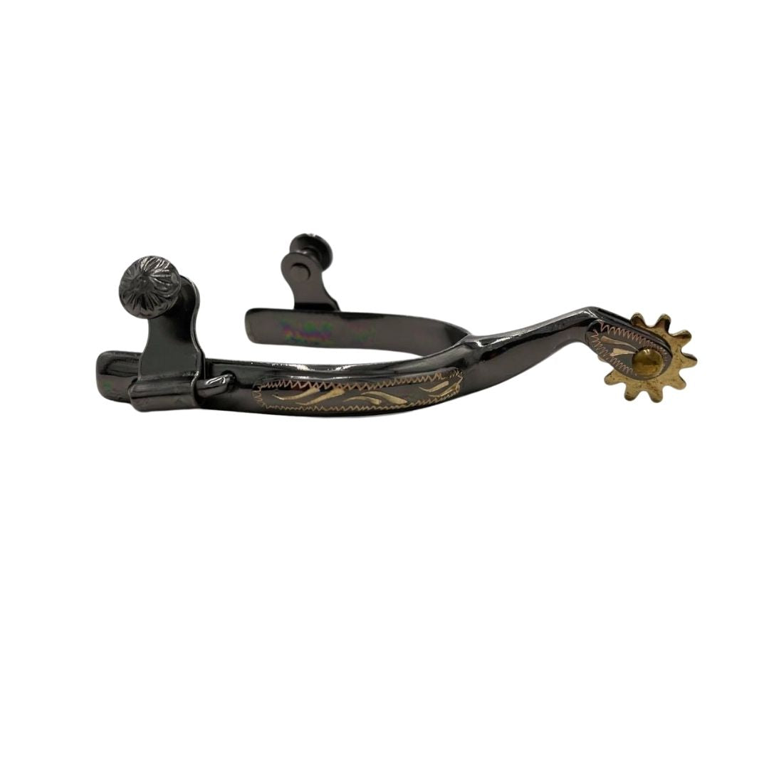 A midnight blue, roping style spur with 1 3/4" gooseneck shank and hand engraved brass overlay. 7/8" 10 point brass rowels and brass, swinging buttons. Lightweight and comfortable