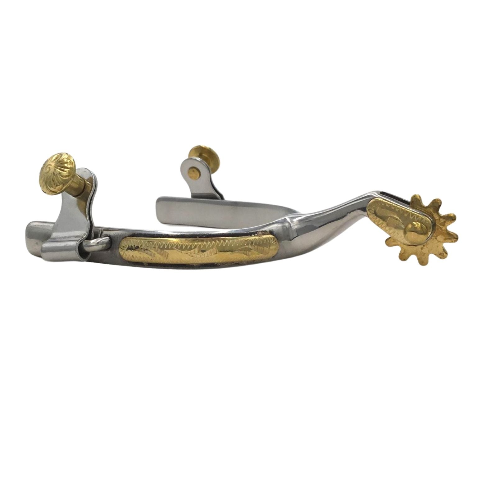 A good looking and easy wearing spur that works to effectively communicate with a horse. A stainless steel gooseneck spur with engraved brass overlay on the band and shank. 1/2" band with 2" shank, brass rowels and brass buttons.