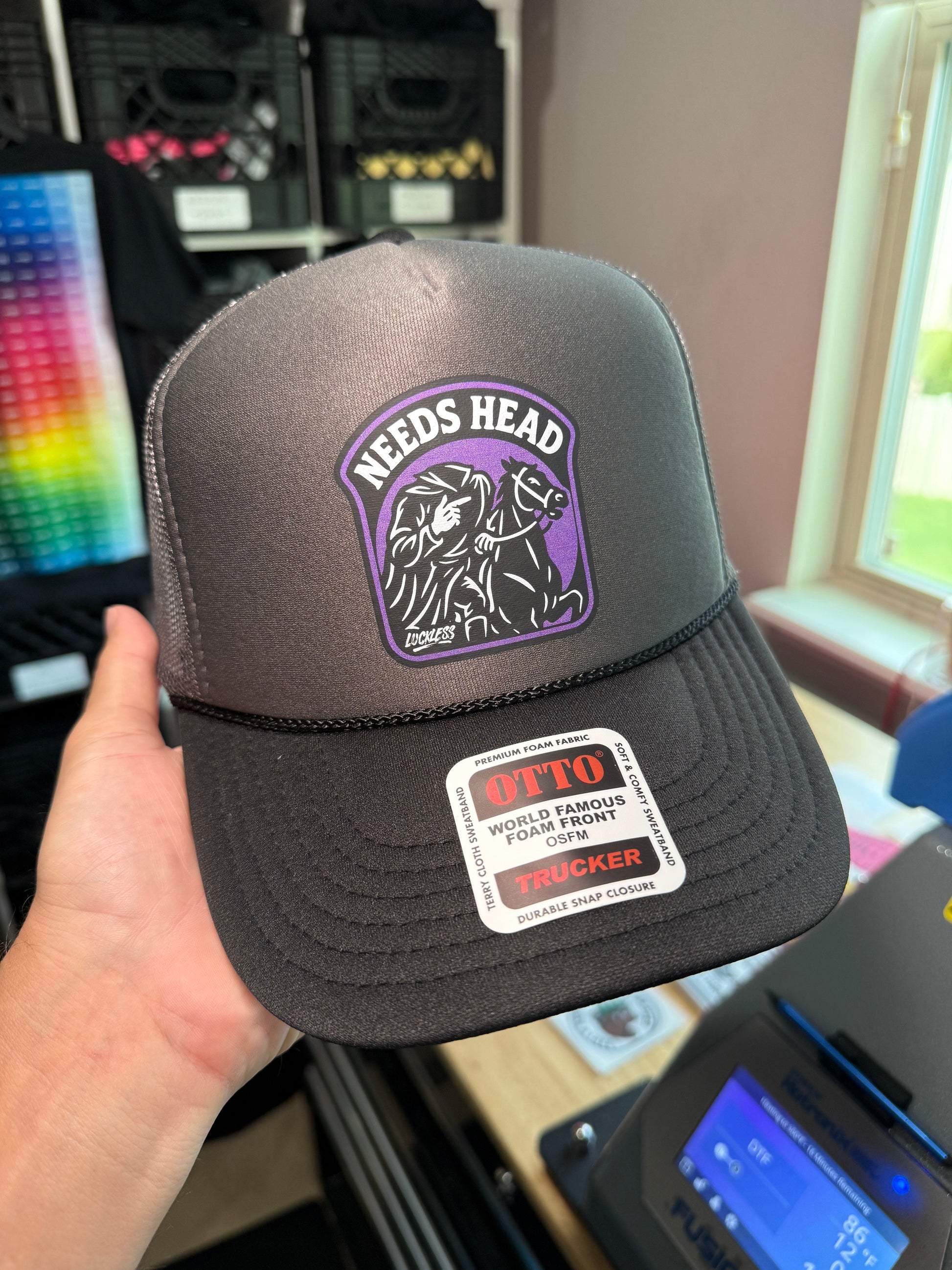 Introducing the “Needs Head” Trucker Hat — a premium foam-front masterpiece for those who prefer their humor as bold as their headwear. Handcrafted on the legendary OTTO base (because your forehead deserves world-famous comfort), this hat isn’t just an accessory — it’s a personality statement. The logo features a noble, slightly bewildered headless horseman in need of… well, a head. Whether you’re braving the heat press or braving public judgment, this cap guarantees double-takes, smirks, and possibly a few awkward conversations at the grocery store.