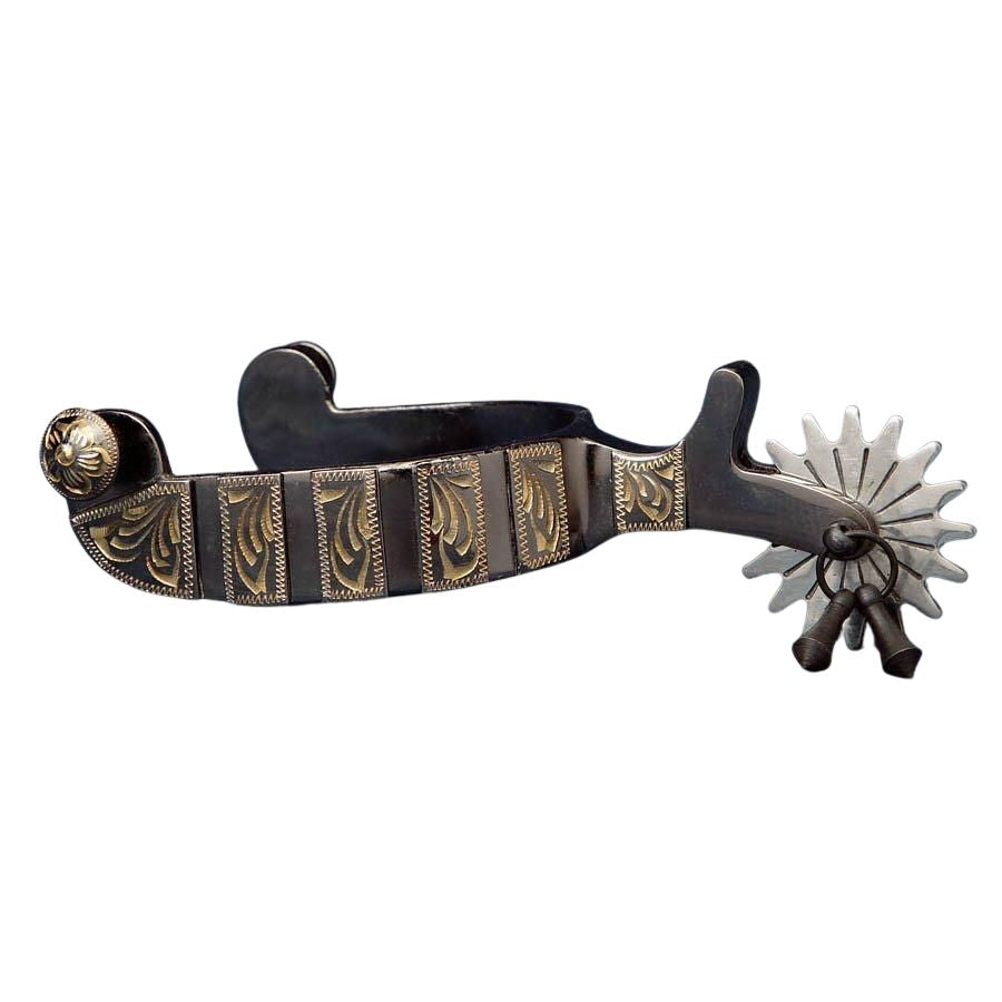 A beautiful midnight blue spur with jingle bobs, 2 1/4" shank with overlayed chap guard and 2 1/8" stainless steel rowels. Hand engraved nickel silver overlay on band.