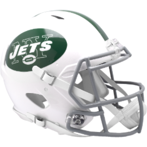 New York Jets Full Size Authentic Revolution Speed NFL Helmet by Riddell. This full size Jets helmet is designed with extended mandible (jaw area) protection, a steel polyvinyl-coated face mask, chin strap, increased padding, an integrated facemask attachment system and elliptical air vents. NFL Team name on back bumper (except Chiefs, Steelers and Giants). The officially licensed New York Jets helmet is great for autographs and features Jets team logo decals on both sides. The striking shape of the future. NFL Jets Authentic Revolution Speed helmet size is 13.5"(L) x 9.75"(W) x 10.25"(H). NFL New York Jets Full Size Helmet.