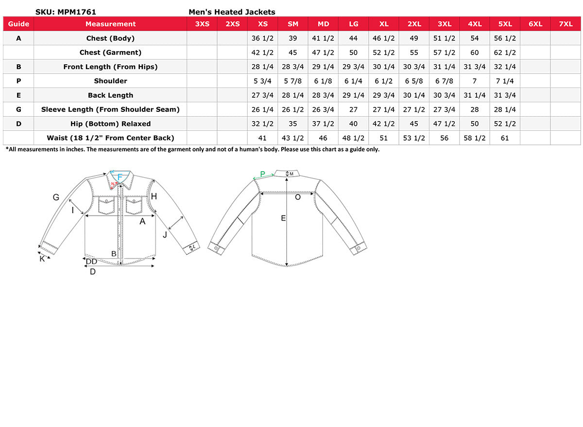 - Power-On Button on Chest (Led Lights Indicate Power is On or Off – Warming jacket Settings Red = High, White = Medium, Blue = Low)
