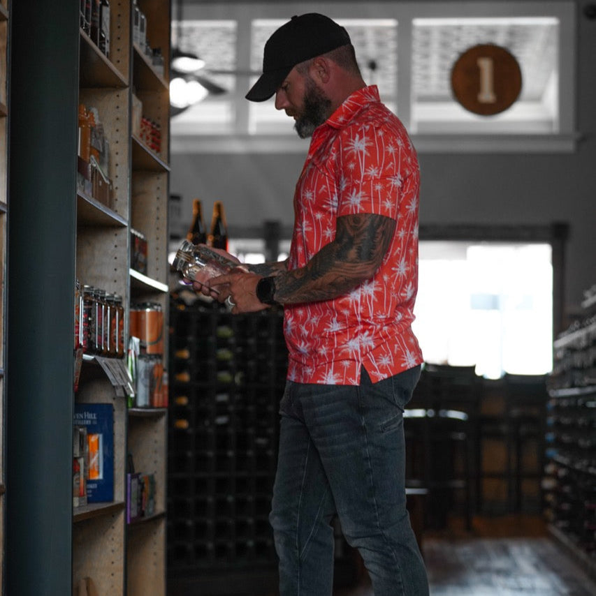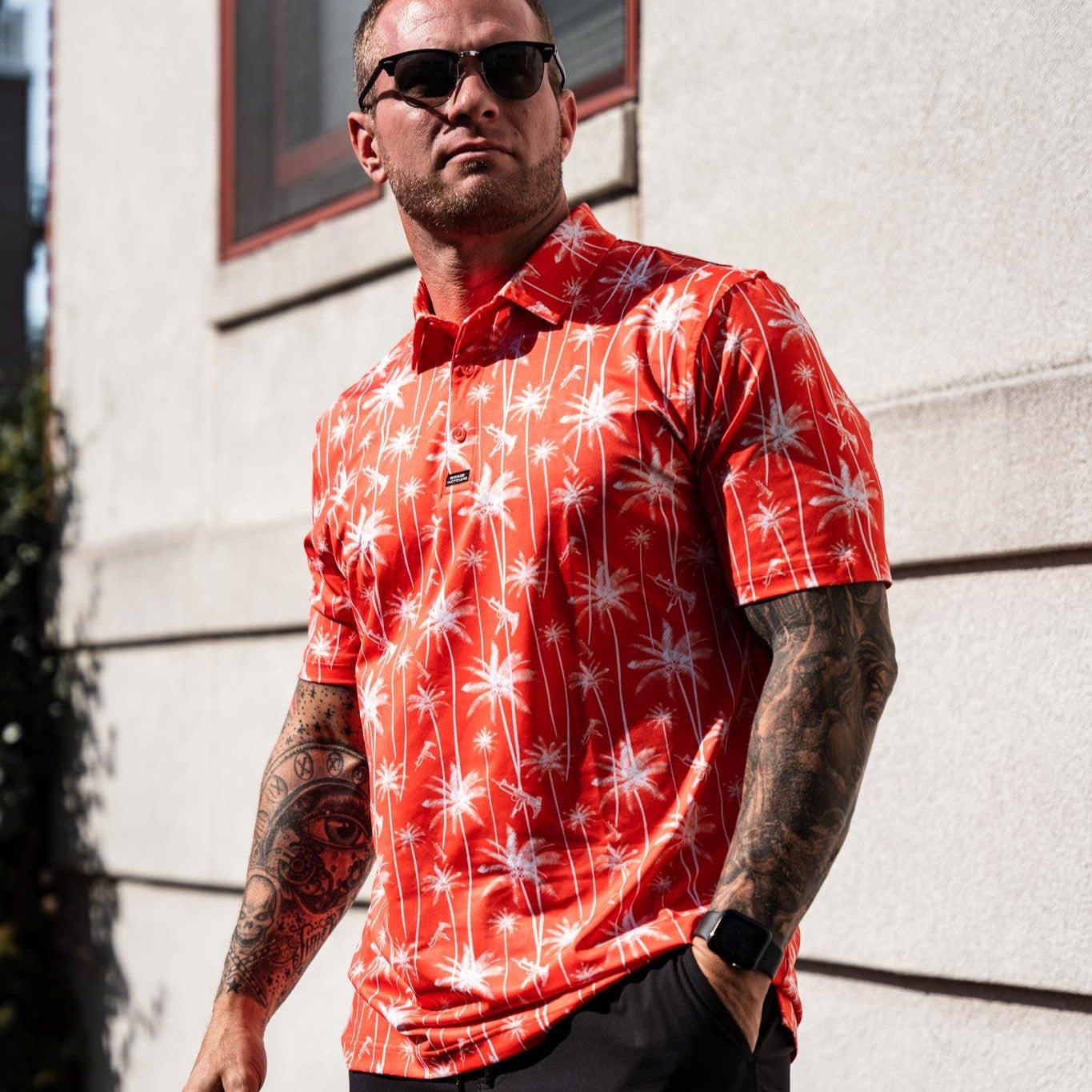 Paradise Palms Performance Polo stands out with its bold orange and white tropical palm tree pattern, engineered to keep you comfortable, protected, and looking sharp. Whether you're dominating 18 holes or chasing shots of Jameson with pickle juice at the neighborhood block party, this polo's moisture-wicking, wrinkle-resistant 4-way stretch fabric offers UPF 30 sun protection while staying breathable. Made from 90% polyester and 10% spandex, it features a relaxed fit and three color-matched pearlized buttons for an edgy, performance-ready look.