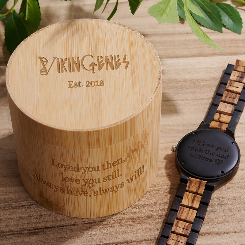 Unique, high-quality wooden watch, engraved with the Vegvisir, runic circle & personalized engraving with your own message on the back & on the box.